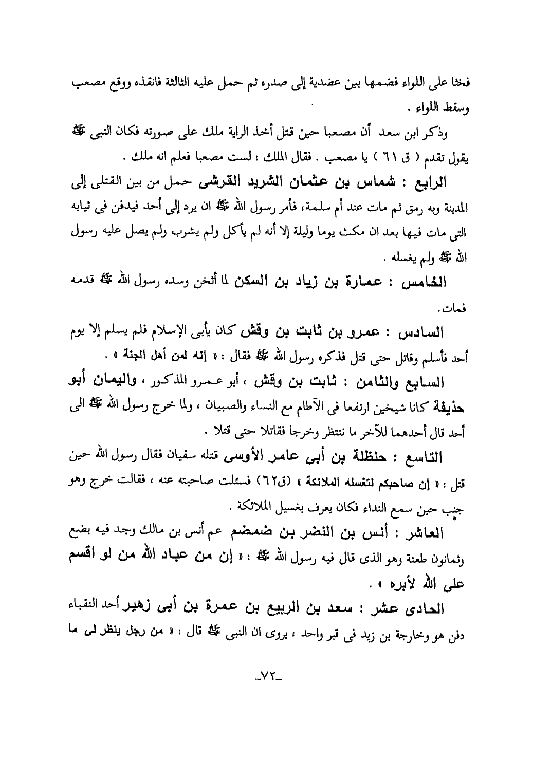 الحادي عشر: سعد بن الربيع بن عمرة بن ابي زهير احد النقباء دفن هو وخارجة بن زيد في قبر واحد، يروى ان النبي صلى الله عليه وسلم قال: "من رجل ينظر لي ما…