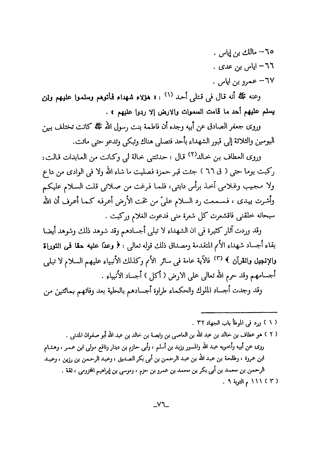 وعنه صلى الله عليه وسلم انه قال في قتلى احد (1): "هؤلاء شهداء فاتوهم وسلموا عليهم ولن يسلم عليهم احد ما قامت السموات والارض الا ردوا عليهم".