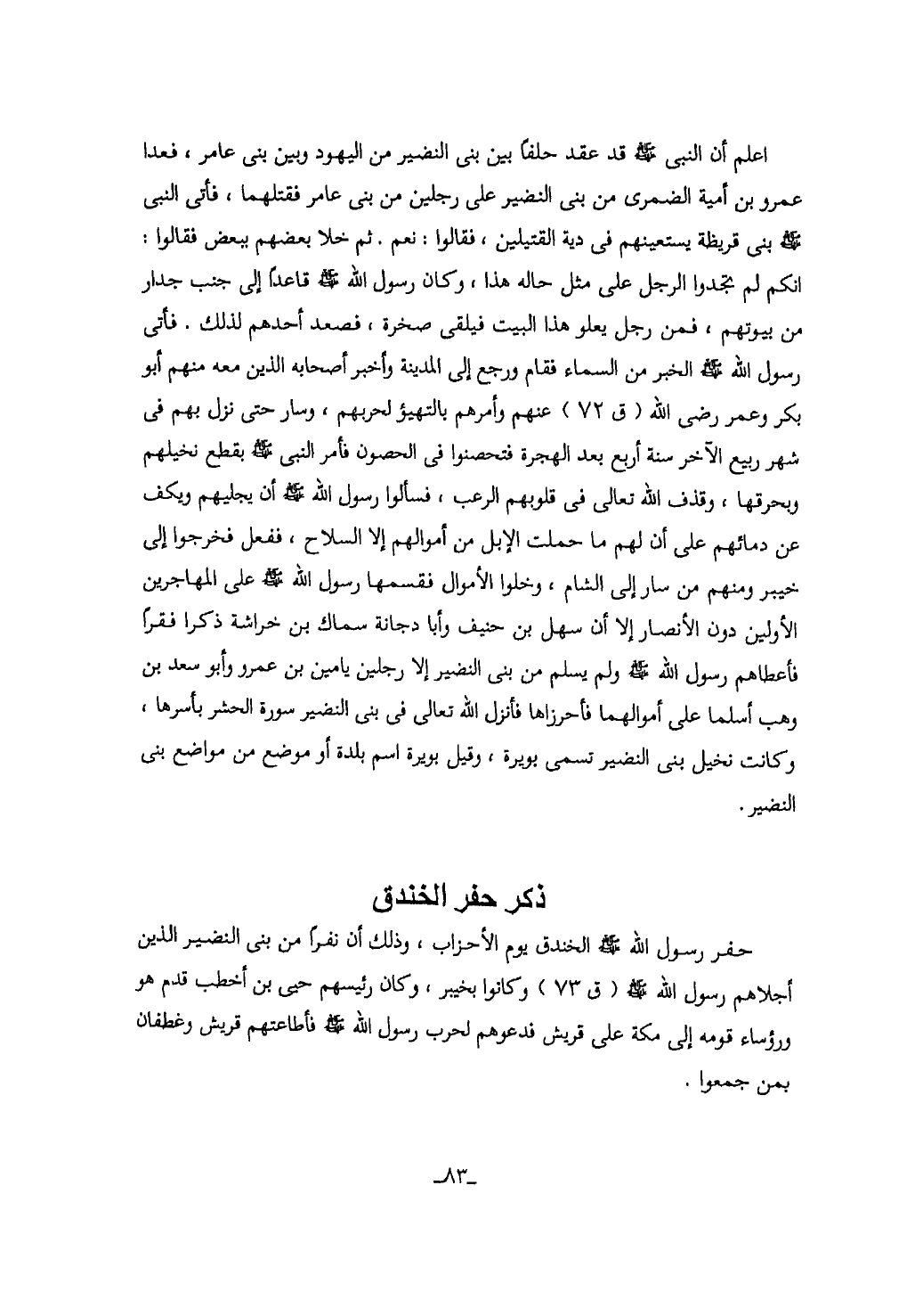 83…اعلم أن النبى صلى الله عليه وسلم قد عقد حلفاً بين بنى النصير من اليهود وبين بنى عامر، فعدا عمرو بن أمية الضمرى من بنى النضير على رجلين من بنى عامر فقتلهما، فأتى النبى صلى الله عليه وسلم بنى قريظة يستعينهم في دية القتيلين، فقالوا: نعم.