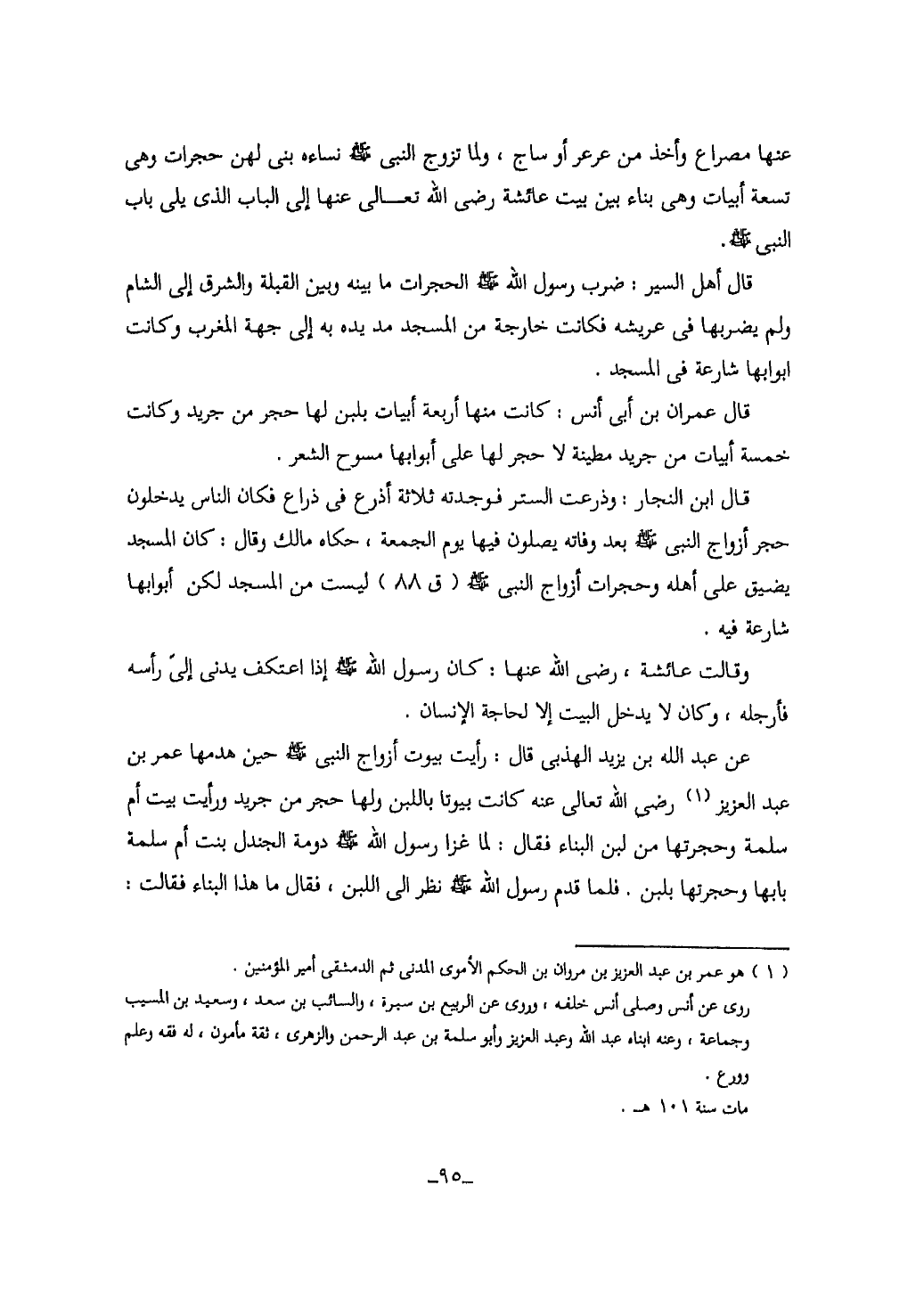 عن عبد الله بن يزيد الهذبى قال: رأيت أزواج النبى صلى الله عليه وسلم حين هدمها عمر بن عبد العزيز (1) رضى الله تعالى عنه كانت بيوتا باللبن ولها حجر من جريد ورأيت بيت أم سلمة وحجرتها من لبن البناء فقال: لما غزا رسول الله صلى الله عليه وسلم دومة الجندل بنت أم سلمة بابها وحجرتها بلبن.