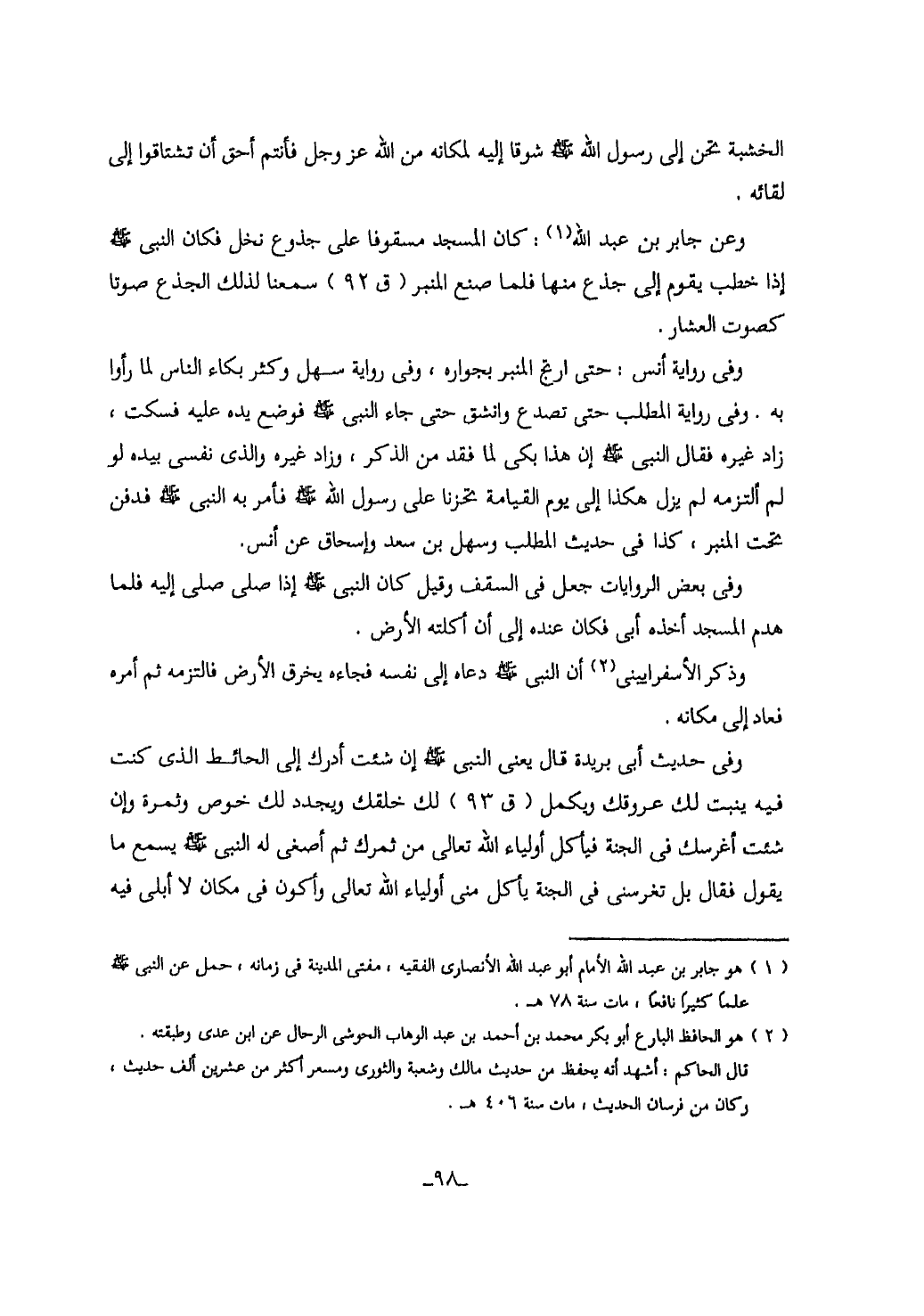 98…الخشبة تحن الى رسول الله صلى الله عليه وسلم شوقا اليه لمكانه من الله عز وجل فأنتم أحق أن تشتاقوا الى لقائه.