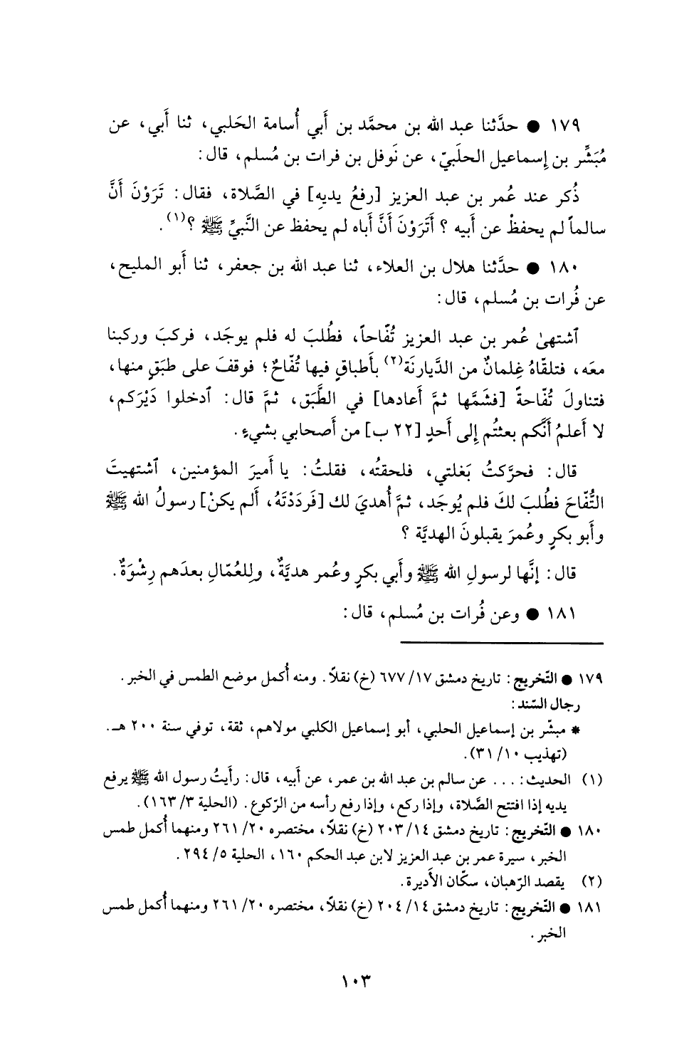 179- حدثنا عبد الله بن محمد بن أبي أسامة الحلبي، ثنا أبي، عن مبشر بن إسماعيل الحلبي، عن نوفل بن فرات بن مسلم، قال: ذكر عند عمر بن عبد العزيز [رفع يديه] في الصلاة، فقال: ترون أن سالماً لم يحفظ عن أبيه؟ أترون أن أباه لم يحفظ عن النبي صلى الله عليه وسلم؟