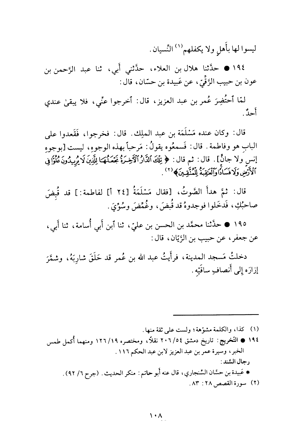 194- حدثنا هلال بن العلاء، حدثني أبي، ثنا عبد الرحمن بن عون بن حبيب الرقي، عن عبيدة بن حسان، قال: لما احتضر عمر بن عبد العزيز، قال: اخرجوا عني، فلا يبقى عندي أحدٌ. قال: وكان عنده مسلمة بن عبد الملك. قال: فخرجوا، فقعدوا على الباب هو وفاطمة، قال: فسمعوه يقول: مرحباً بهذه الوجوه، ليست [بوجوه إنسٍ ولا جان] . قال: ثم قال: {تلك الدار الآخرة نجعلها للذين لا يريدون علواً في الأرض ولا فساداً والعاقبة للمتقين} . قال: ثم هدأ الصوت، [فقال مسلمة لفاطمة:] قد قبض صاحبك، فدخلوا فوجوده قد قبض، وغمض وسوي.