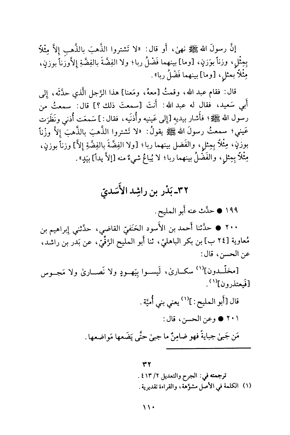 إن رسول الله صلى الله عليه وسلم نهى، أو قال: ((لا تشتروا الذهب بالذهب إلا مثلاً بمثلٍ، وزناً بوزنٍ [وما] بينهما فضل ربا، ولا الفضة بالفضة إلا وزناً بوزنٍ، مثلاً بمثلٍ، [وما] بينهما فضل ربا)) . قال: فقام عبد الله، وقمت [معه، ومعنا] هذا الرجل الذي حدثه، إلى أبي سعيد، فقال له عبد الله: أنت [سمعت ذلك؟] قال: سمعت من رسول الله صلى الله عليه وسلم؛ فأشار بيديه [إلى عينيه وأذنيه، فقال:] سمعت أذني ونظرت عيني؛ سمعت رسول الله صلى الله عليه وسلم يقول: ((لا تشتروا الذهب بالذهب إلا وزناً بوزنٍ، مثلاً بمثلٍ، والفضل بينهما ربا؛ [ولا الفضة بالفضة إلا] وزناً بوزنٍ، مثلاً بمثلٍ، والفضل بينهما ربا؛ لا يباع شيءٌ منه [إلا يداً] بيدٍ)) .