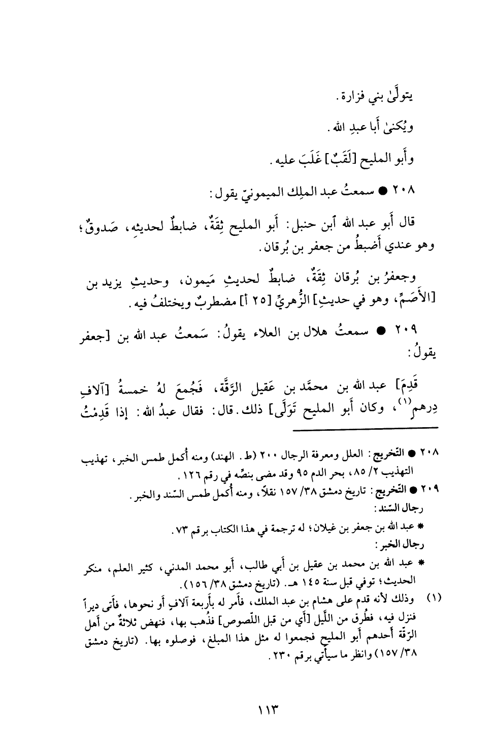 208- سمعت عبد الملك الميموني يقول: قال أبو عبد الله ابن حنبل: أبو المليح ثقةٌ، ضابطٌ لحديثه، صدوقٌ؛ وهو عندي أضبط من جعفر بن برقان. وجعفر بن برقان ثقةٌ، ضابطٌ لحديث ميمون، وحديث يزيد بن [الأصم، وهو في حديث] الزهري مضطربٌ ويختلف فيه.