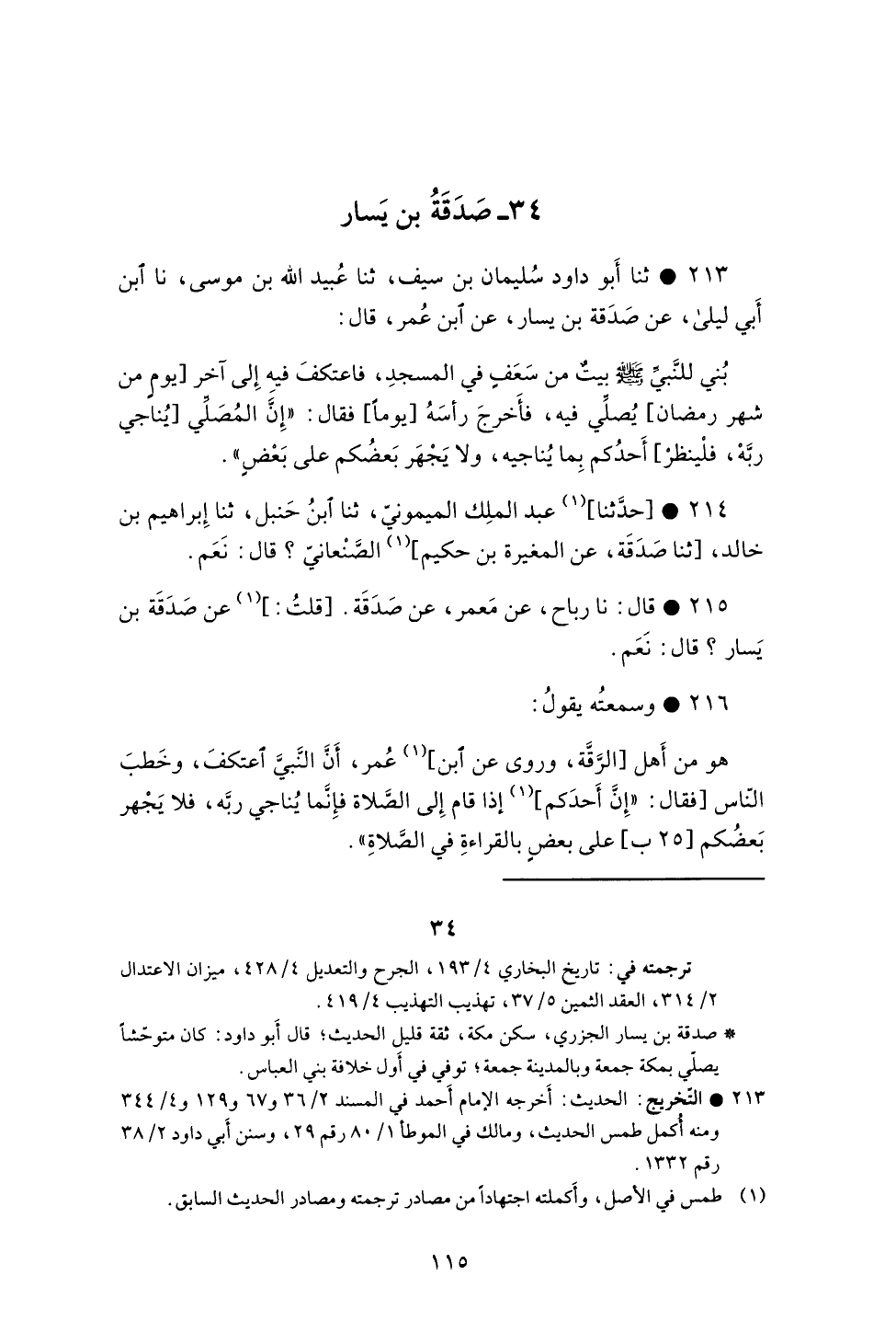 216- وسمعته يقول: هو من أهل [الرقة، وروى عن ابن] عمر، أن النبي اعتكف، وخطب الناس [فقال: ((إن أحدكم] إذا قام إلى الصلاة فإنما يناجي ربه، فلا يجهر بعضكم على بعضٍ بالقراءة في الصلاة)) .