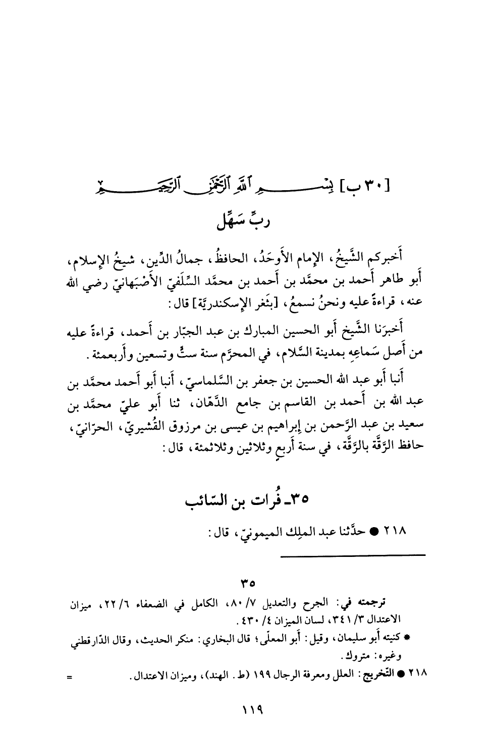 أخبركم الشيخ الإمام الأوحد، الحافظ، جمال الدين، شيخ الإسلام، أبو طاهر أحمد بن محمد بن أحمد بن محمد السلفي الأصبهاني رضي الله عنه، قراءةً عليه ونحن نسمع، [بثغر الإسكندرية] قال: أخبرنا الشيخ أبو الحسين المبارك بن عبد الجبار بن أحمد، قراءةً عليه من أصل سماعه بمدينة السلام، في المحرم سنة ست وتسعين وأربعمئة. أنبأ أبو عبد الله الحسين بن جعفر بن السلماسي، أنبأ أبو أحمد محمد بن عبد الله بن أحمد بن القاسم بن جامع الدهان، ثنا أبو علي محمد بن سعيد بن عبد الرحمن بن إبراهيم بن عيسى بن مرزوق القشيري، الحراني، حافظ الرقة بالرقة، في سنة أربعٍ وثلاثين وثلاثمئة، قال:
