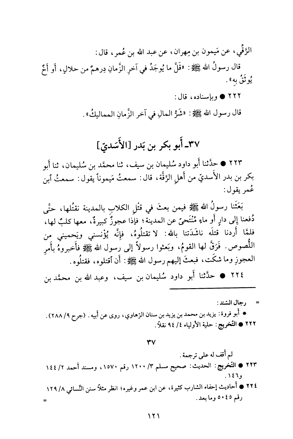 223- حدثنا أبو داود سليمان بن سيف، ثنا محمد بن سليمان، ثنا أبو بكر بن بدر الأسدي من أهل الرقة، قال: سمعت ميموناً يقول: سمعت ابن عمر يقول: بعثنا رسول الله صلى الله عليه وسلم فيمن بعث في قتل الكلاب بالمدينة نقتلها، حتى دفعنا إلى دارٍ أو ماءٍ منتحى عن المدينة؛ فإذا عجوزٌ كبيرةٌ، معها كلبٌ لها، فلما أردنا قتله ناشدتنا بالله: لا تقتلوه، فإنه يؤنسني ويحميني من اللصوص. فرق لها القوم، وبعثوا رسولاً إلى رسول الله صلى الله عليه وسلم فأخبروه بأمر العجوز وما شكت، فبعث إليهم رسول الله صلى الله عليه وسلم: أن اقتلوه، فقتلوه.
