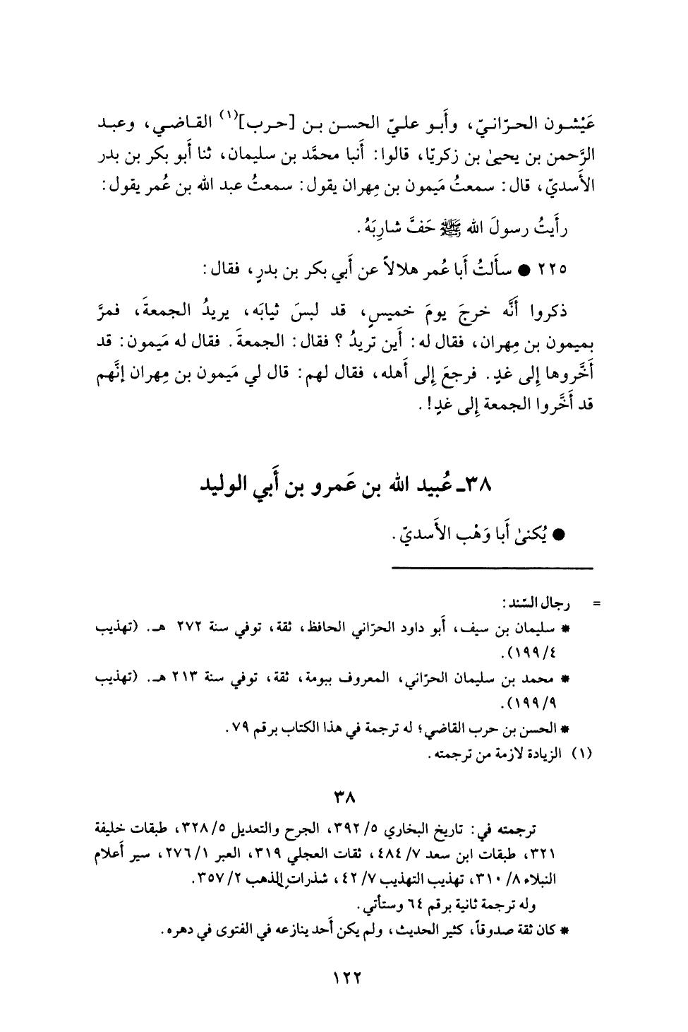 225- سألت أبا عمر هلالاً عن أبي بكر بن بدرٍ، فقال: ذكروا أنه خرج يوم خميسٍ، قد لبس ثيابه، يريد الجمعة، فمر بميمون بن مهران، فقال له: أين تريد؟ فقال: الجمعة. فقال له ميمون: قد أخروها إلى غدٍ. فرجع إلى أهله، فقال لهم: قال لي ميمون بن مهران إنهم قد أخروا الجمعة إلى غدٍ!