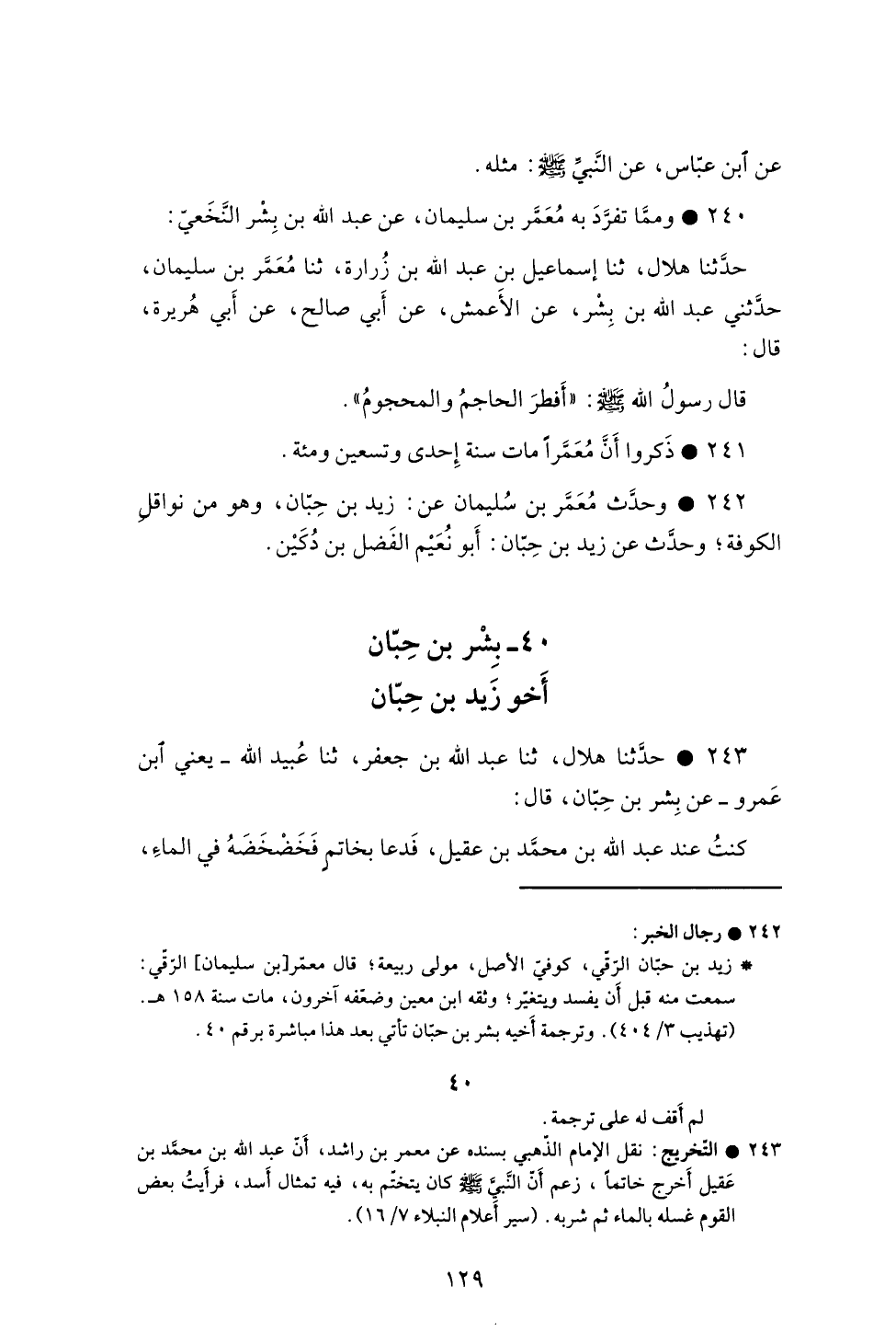242- وحدث معمر بن سليمان عن: زيد بن حبان، وهو من نواقل الكوفة؛ وحدث عن زيد بن حبان: أبو نعيم الفضل بن دكين.
