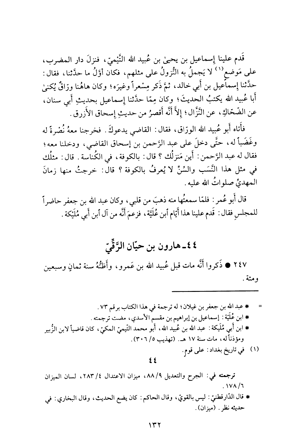 قدم علينا إسماعيل بن يحيى بن عبيد الله التيمي، فنزل دار المضرب، على موضعٍ لا يجمل به النزول على مثلهم، فكان أول ما حدثنا، فقال: حدثنا إسماعيل بن أبي خالد، ثم ذكر مسعراً وغيره؛ وكان هاهنا وراقٌ يكنى أبا عبيد الله يكتب الحديث؛ وكان مما حدثنا إسماعيل بحديث أبي سنان، عن الضحاك، عن النزال؛ إلا أنه أقصر من حديث إسحاق الأزرق. فأتاه أبو عبيد الله الوراق، فقال: القاضي يدعوك: فخرجنا معه نصرةً له وغضباً له، حتى دخل على عبد الرحمن بن إسحاق القاضي، ودخلنا معه؛ فقال له عبد الرحمن: أين منزلك؟ قال: بالكوفة، في الكناسة. قال: مثلك في مثل هذا النسب والسن لا يعرف بالكوفة؟ قال: خرجت منها زمان المهدي صلوات الله عليه. قال أبو عمر: فلما سمعتها منه ذهب من قلبي، وكان عبد الله بن جعفر حاضراً للمجلس فقال: قدم علينا هذا أيام ابن علية، فزعم أنه من آل ابن أبي مليكة.