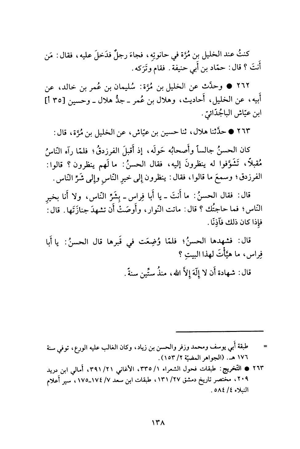 263- حدثنا هلال، ثنا حسين بن عياش، عن الخليل بن مرة، قال: كان الحسن جالساً وأصحابه حوله، إذ أقبل الفرزدق؛ فلما رآه الناس مقبلاً، تشوفوا له ينظرون إليه، فقال الحسن: ما لهم ينظرون؟ قالوا: الفرزدق؛ وسمع ما قالوا، فقال: ينظرون إلى خير الناس وإلى شر الناس. قال: فقال الحسن: ما أنت -يا أبا فراس- بشر الناس، ولا أنا بخير الناس؛ فما حاجتك؟ قال: ماتت النوار، وأوصت أن تشهد جنازتها. قال: فإذا كان ذلك فآذنا. قال: فشهدها الحسن؛ فلما وضعت في قبرها قال الحسن: يا أبا فراس، ما هيأت لهذا البيت؟ قال: شهادة أن لا إله إلا الله، منذ ستين سنةً.