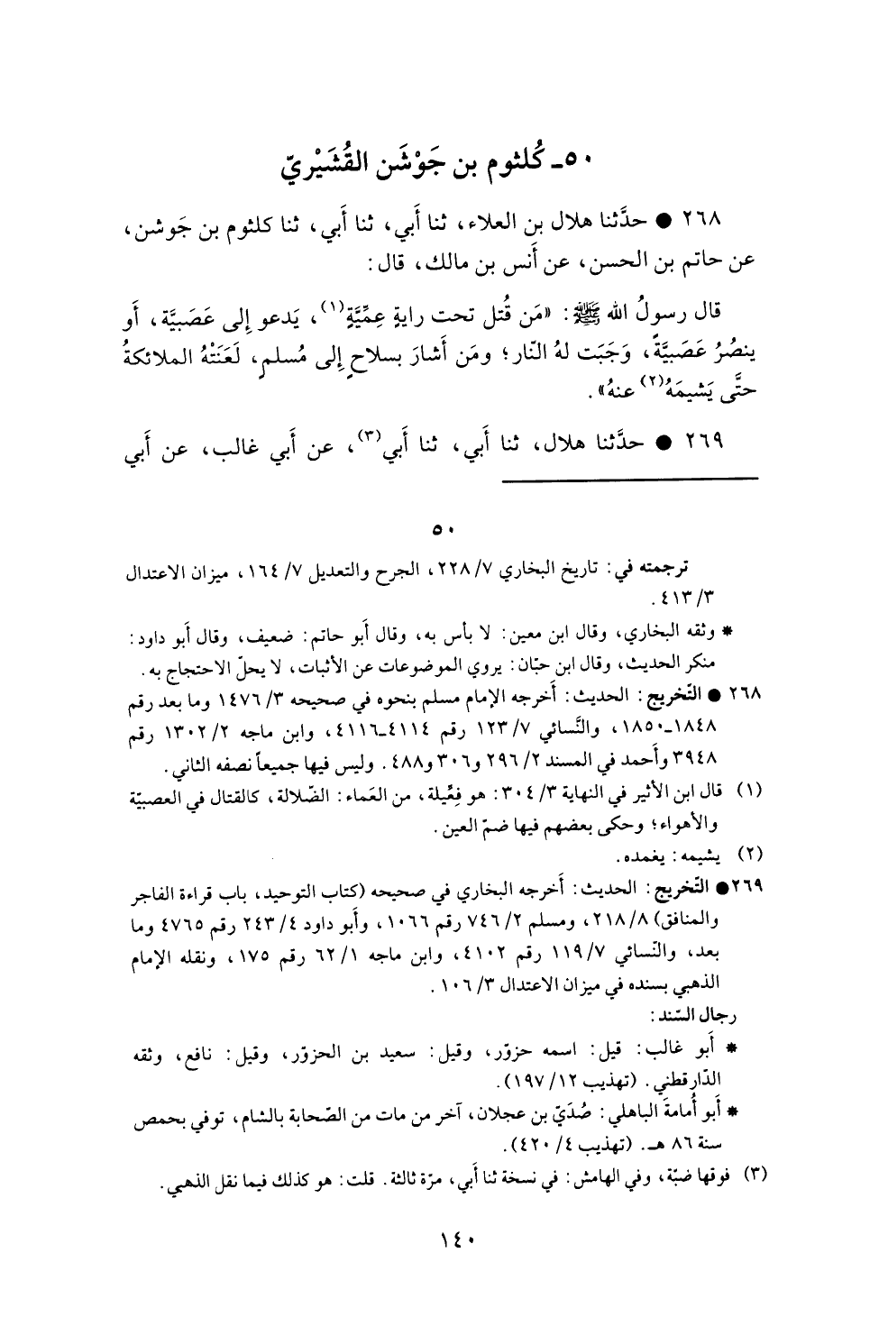 268- حدثنا هلال بن العلاء، ثنا أبي، ثنا أبي، ثنا كلثوم بن جوشن، عن حاتم بن الحسن، عن أنس بن مالك، قال: قال رسول الله صلى الله عليه وسلم: ((من قتل تحت راية عميةٍ، يدعو إلى عصبية، أو ينصر عصبيةً، وجبت له النار؛ ومن أشار بسلاحٍ إلى مسلمٍ، لعنته الملائكة حتى يشيمه عنه)) .