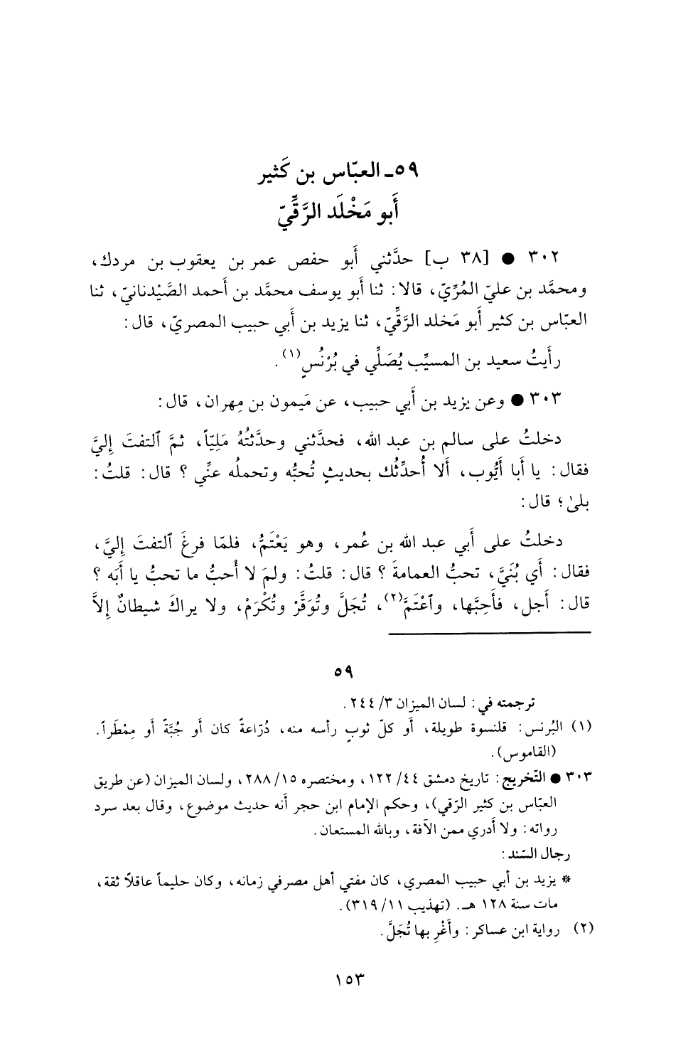 302- حدثني أبو حفص عمر بن يعقوب بن مردك، ومحمد بن علي المري، قالا: ثنا أبو يوسف محمد بن أحمد الصيدناني، ثنا العباس بن كثير أبو مخلد الرقي، ثنا يزيد بن أبي حبيب المصري، قال: رأيت سعيد بن المسيب يصلي في برنس.