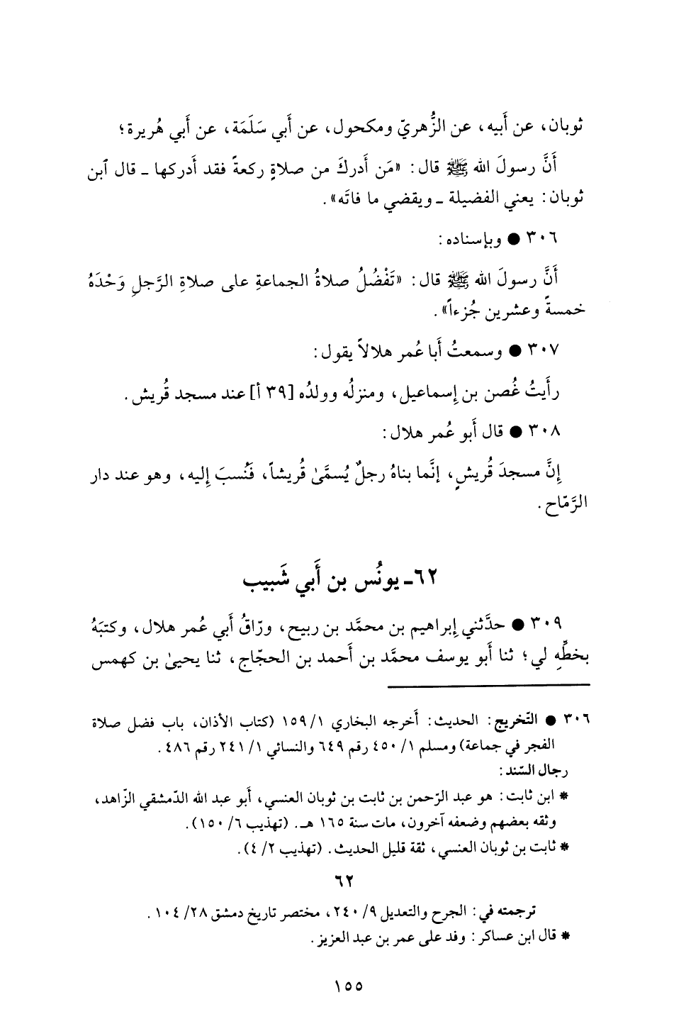309- حدثني إبراهيم بن محمد بن ربيح، وراق أبي عمر هلال، وكتبه بخطه لي؛ ثنا أبو يوسف محمد بن أحمد بن الحجاج، ثنا يحيى بن كهمس