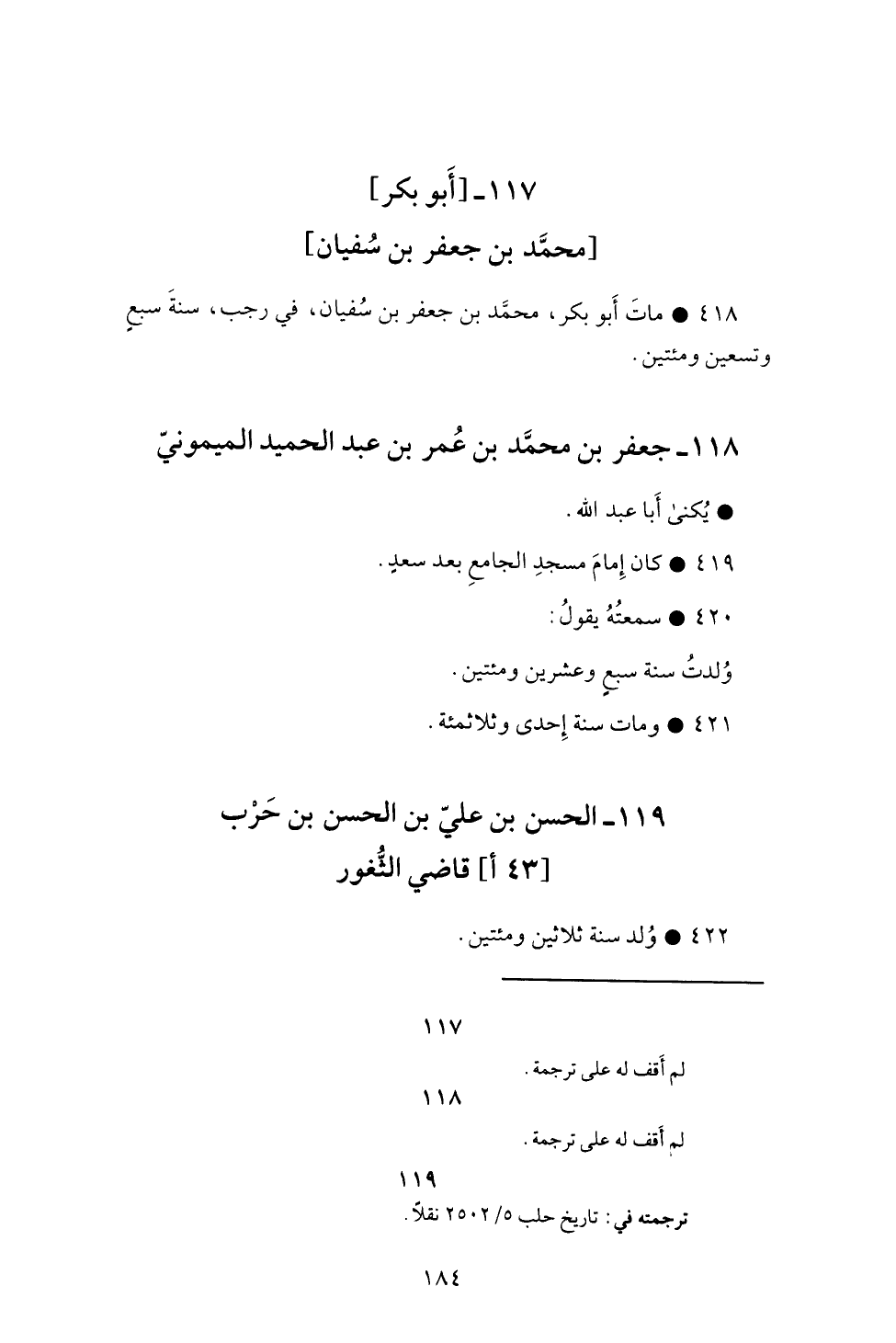 418- مات أبو بكر، محمد بن جعفر بن سفيان، في رجب، سنة سبعٍ وتسعين ومئتين.