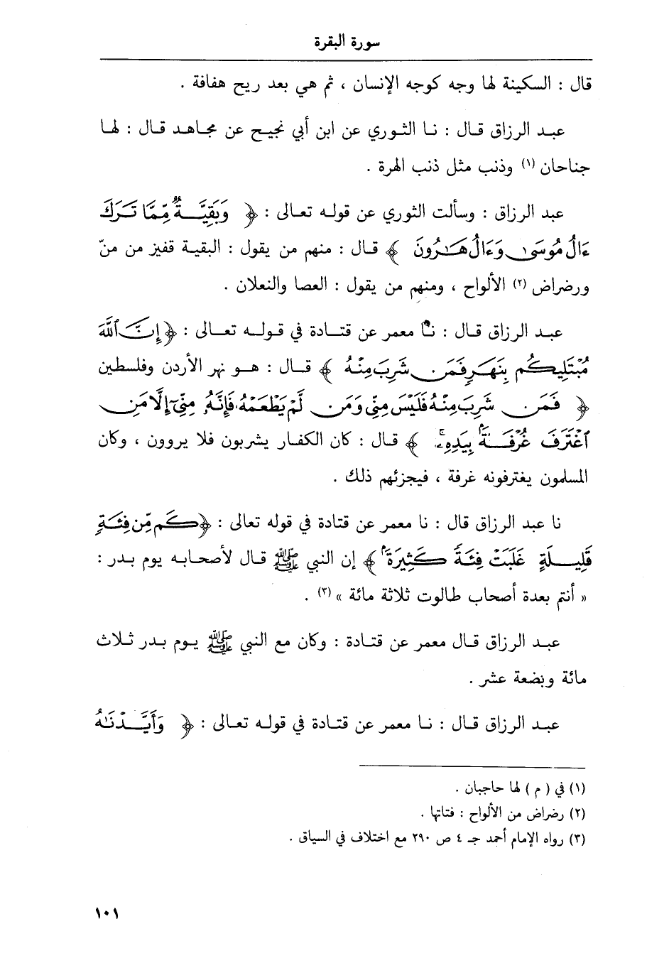 نا عبد الرزاق قال نا معمر عن قتادة في قوله تعالى كم من فئة قليلة غلبت فئة كثيرة إن النبي قال لأصحابه يوم بدر أنتم بعدة أصحاب طالوت ثلاثة مائة