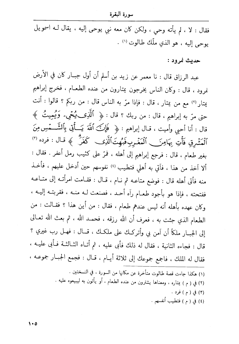 عبد الرزاق قال نا معمر عن زيد بن أسلم أن أول جبار كان في الأرض نمرود قال وكان الناس يخرجون يمتارون من عنده الطعام فخرج إبراهيم يمتار مع من يمتار قال فإذا مر به الناس قال من ربكم قالوا أنت حتى مر به إبراهيم قال من ربك قال الذي يحى ويميت قال أنا أحيي وأميت قال إبراهيم فإن الله يأتي بالشمس من المشرق فأت بها من المغرب فبهت الذي كفر قال فرده بغير طعام قال فرجع إبراهيم إلى أهله فمر على كثيب رمل أعفر فقال ألا آخذ من هذا فآتي به أهلي فتطيب نفوسهم حين أدخل عليهم فأخذ منه فأتى أهله قال فوضع متاعه ثم نام قال فقامت امرأته إلى متاعه ففتحته فإذا هو بأجود طعام رآه أحد فصنعت له منه فقربته إليه وكان عهده بأهله أنه ليس عندهم طعام فقال من أين هذا فقالت من الطعام الذي جئت به فعرف أن الله زرقة فحمد الله ثم بعث الله تعالى إلى الجبار ملكا أن آمن بي وأتركك على ملكك قال فهل رب غيري قال فجاءه الثانية فقال له ذلك فأبى عليه ثم أتاه الثالثة فأبى عليه فقال له الملك فاجمع جموعك إلى ثلاثة أيام فجمع الجبار جموعه