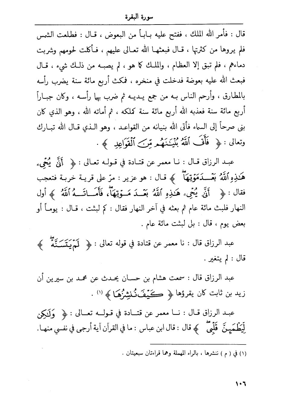 عبد الرزاق قال نامعمر عن قتادة في قوله تعالى إنى يحى هذه الله بعد موتها قال هو عزير مر على قرية خربة فتعجب فقال أنى يحى هذه الله بعد موتها فأماته الله أول النهار فلبث مائة عام ثم بعثه في آخر النهار فقال كم لبثت قال يوما أو بعض يوم قال بل لبثت مائة عام