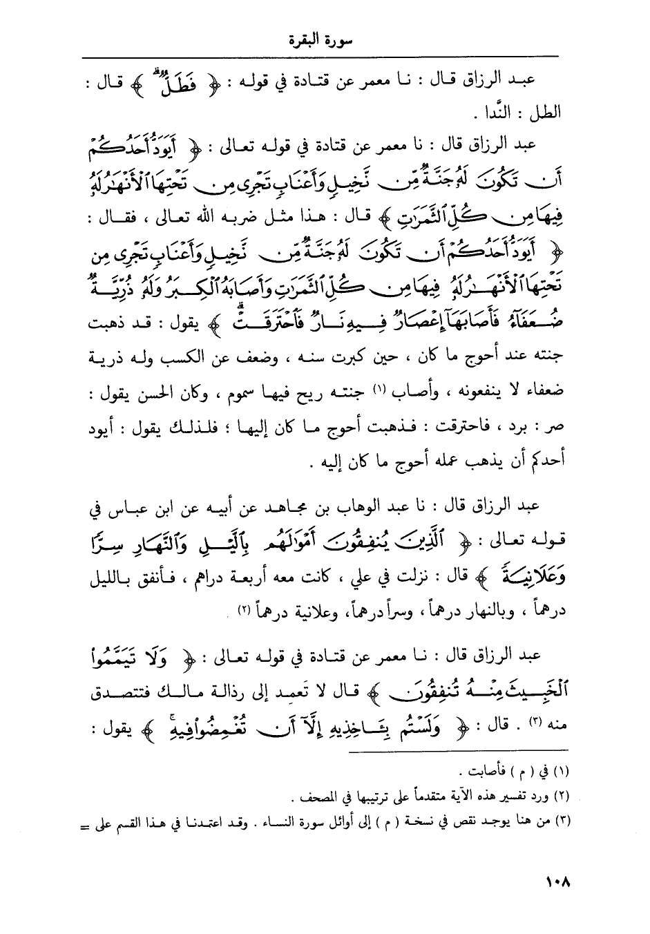 عبد الرزاق قال نا معمر عن قتادة في قوله تعالى أيود أحدكم أن تكون له جنة من نخيل وأعناب تجرى من تحتها الأنهر له فيها من كل الثمرت قال هذا مثل ضربه الله تعالى فقال أيود أحدكم أن تكون له جنة من نخيل واعناب تجرى من تحتها الأنهر له فيها من كل الثمرات وأصابه الكبر وله ذرية ضعفاء فأصابها إعصار فيه نار فاحترقت يقول قد ذهبت جنته عند أحوج ما كان حين كبرت سنه وضعف عن الكسب وله ذرية ضعفاء لا ينفعونه وأصاب جنته ريح فيها سموم وكان الحسن يقول صر برد فاحترقت فذهبت أحوج ما كان إليها فلذلك يقول أيود أحدكم أن يذهب عمله أحوج ما كان إليه