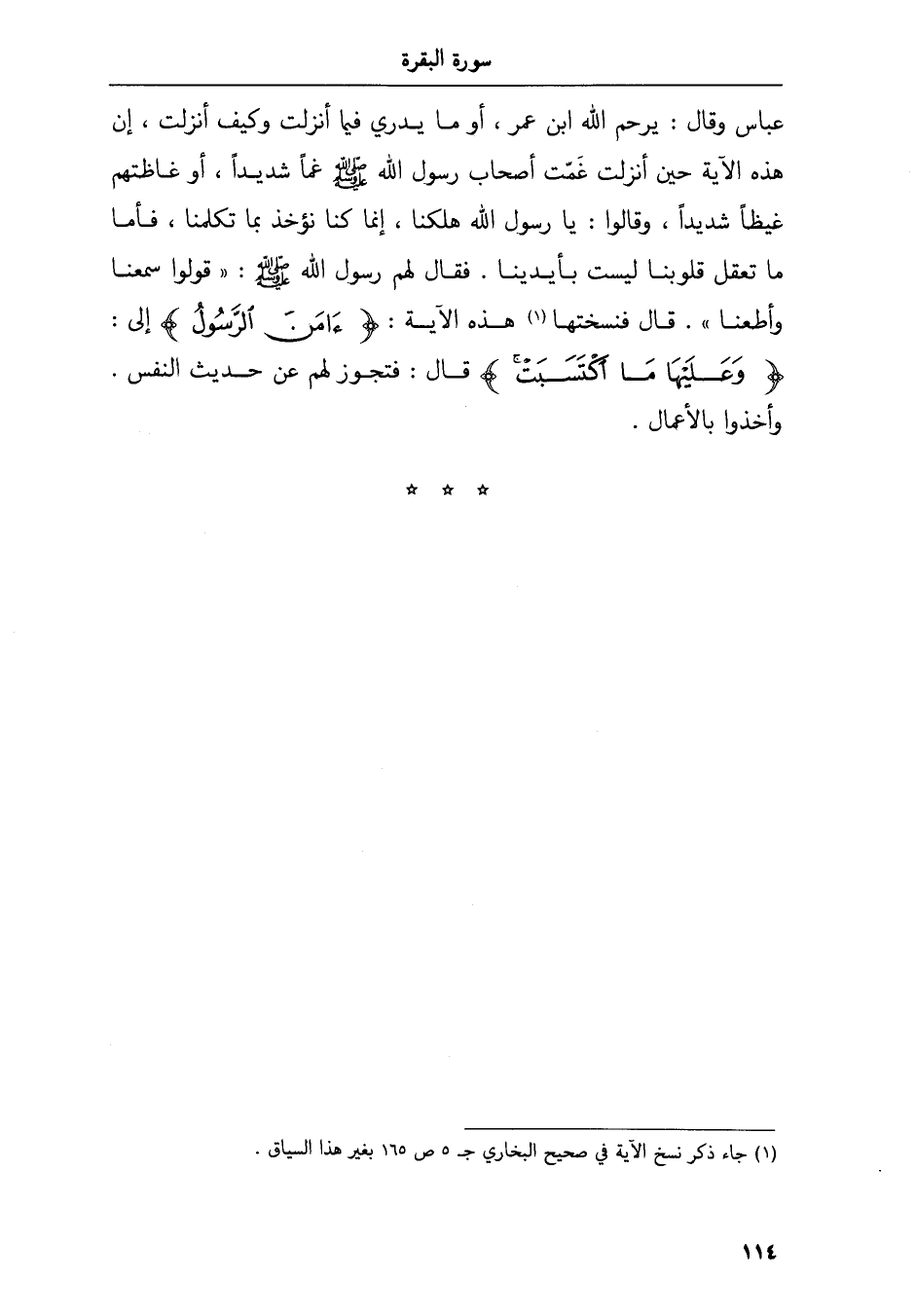 عباس وقال يرحم الله ابن عمر أو ما يدري فيما أنزلت وكيف أنزلت إن هذه الآية حين أنزلت غمت أصحاب رسول الله غما شديدا أو غاظتهم غيظا شديدا وقالوا يا رسول الله هلكنا إنما كنا نؤخذ بما تكلمنا فأما ما تعقل قلوبنا ليست بأيدينا فقال لهم رسول الله قولوا سمعنا وأطعنا قال فنسختها هذه الآية ءامن الرسول إلى وعليها ما اكتسبت قال فتجوز لهم عن حديث النفس وأخذوا بالأعمال