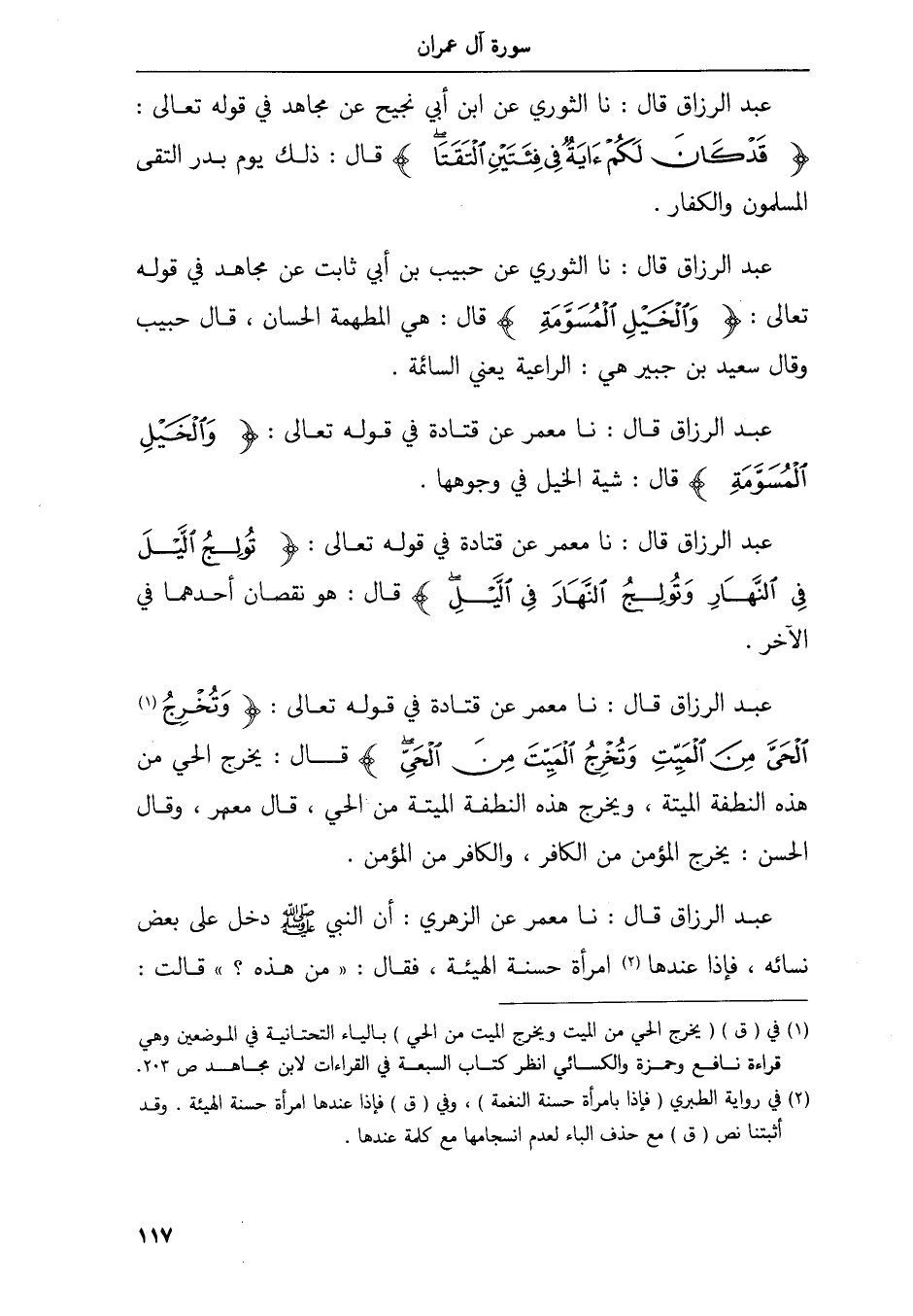 عبد الرزاق قال نا الثوري عن حبيب عن أبي ثابت عن مجاهد في قوله تعالى والخيل المسومة قال هي المطهمة الحسان قال حبيب وقال سعيد بن جبير هي الراعية يعني السائمة