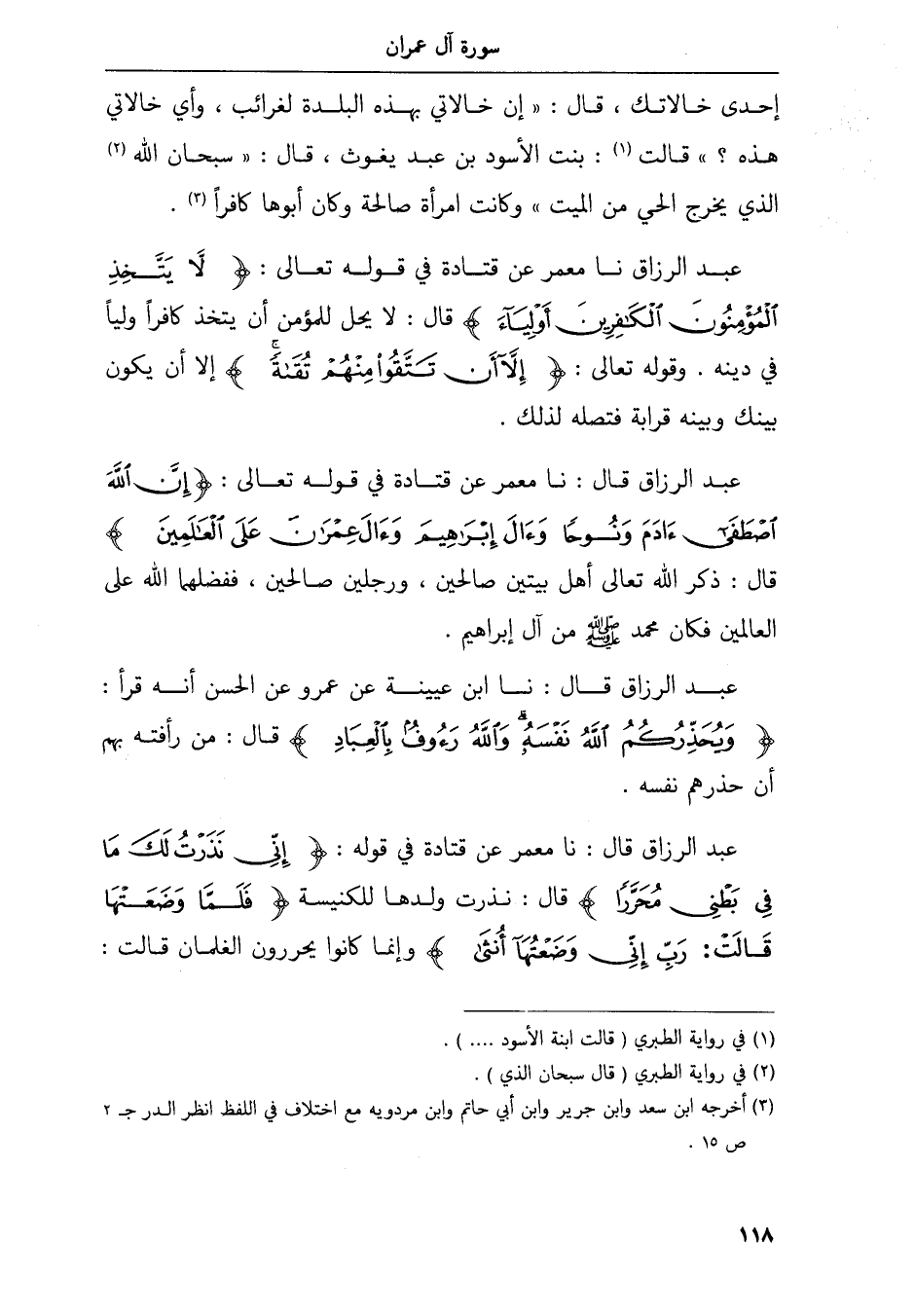 عبد الرزاق قال نا معمر عن قتادة في قولة تعالى إن الله اصطفى ءادم ونوحا وءال إبراهيم وءال عمران على العلمين قال ذكر الله تعالى أهل بيتين صالحين ورجلين صالحين ففضلهما الله على العالمين فكان محمد من آل إبراهيم
