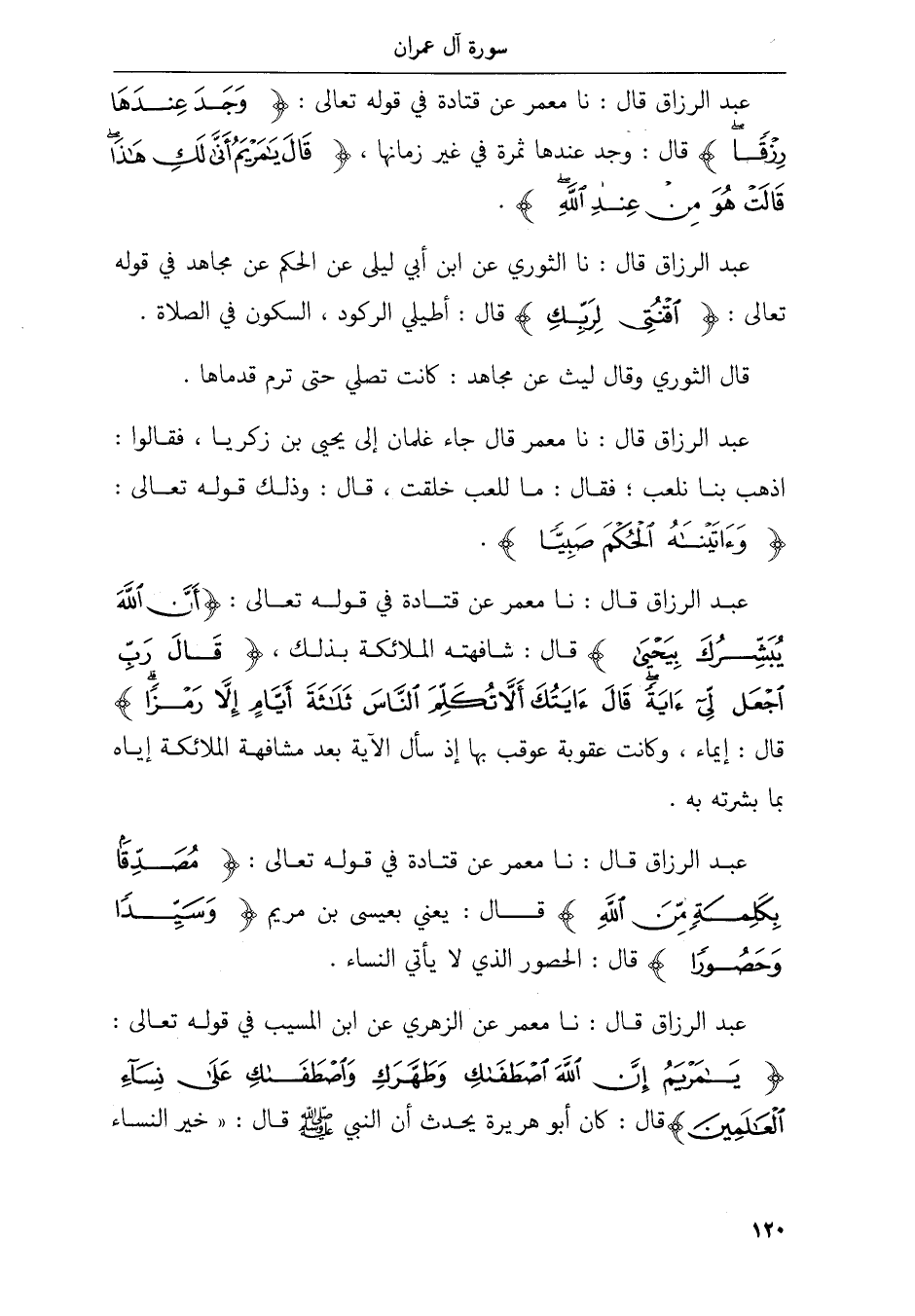 عبد الرزاق قال نا معمر عن الزهري عن ابن المسيب في قوله تعالى يمريم إن الله اصطفك وطهرك واصطفك على نساء العلمين قال كان أبو هريرة يحدث أن النبي قال خير النساء