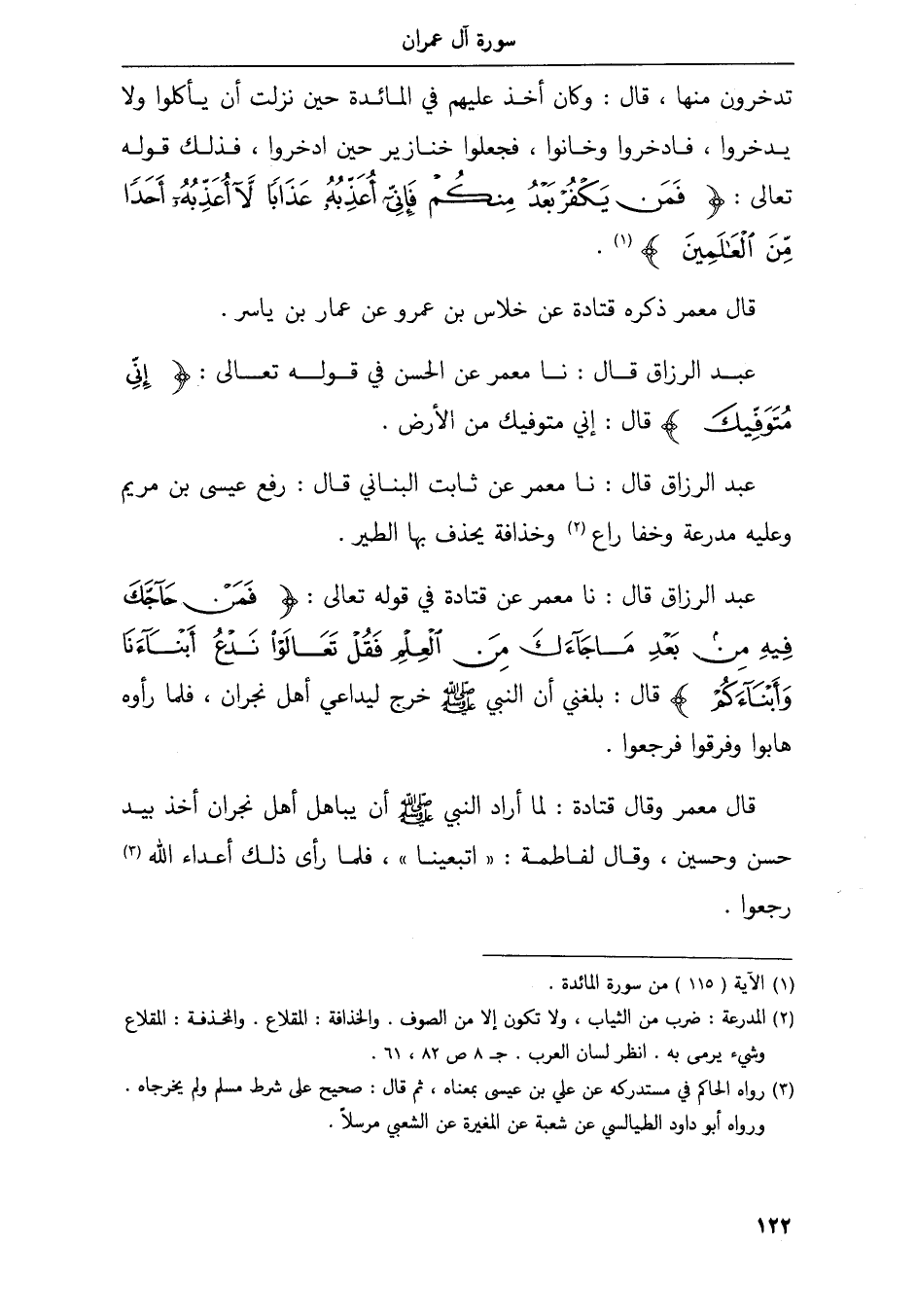 عبد الرزاق قال نا معمر عن قتادة في قوله تعالى فمن حاجك من بعد ما جاءك من العلم فقل تعالوا ندع أبناءنا وأبناءكم قال بلغني أن النبي خرج ليداعي أهل نجران فلما رأوه هابوا وفرقوا فرجعوا