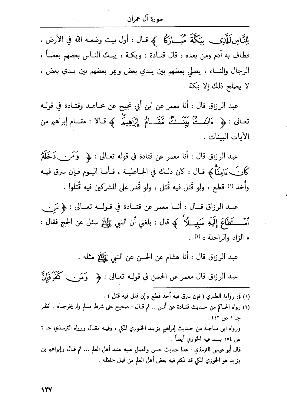 عبد الرزاق قال أنا معمر عن ابن أبي نجيح عن مجاهد وقتادة في قوله تعالى ءايت بينت مقام إبراهيم قالا مقام إبراهيم من الآيات البينات