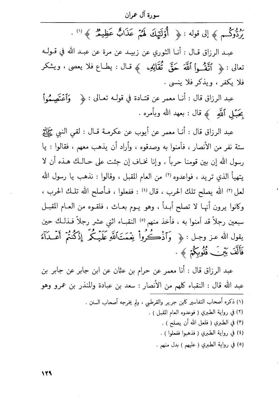 عبد الرزاق قال أنا معمر عن أيوب عن عكرمة قال لقي النبي ستة نفر من الأنصار فآمنوا به وصدقوه وأراد أن يذهب معهم فقالوا يا رسول الله إن بين قومنا حربا وإنا نخاف إن جئت على حالك هذه أن لا يتهيأ الذي تريد فواعدوه من العام المقبل وقالوا نذهب يا رسول الله لعل الله يصلح تلك الحرب قال ففعلوا فأصلح الله تلك الحرب وكانوا يرون أنها لا تصلح أبدا وهو يوم بعاث فلقوه من العام المقبل سبعين رجلا قد آمنوا به فأخذ منهم النقباء اثني عشر رجلا فذلك حين يقول الله عز و جل واذكروا نعمت الله عليكم إذ كنتم أعداء فألف بين قلوبكم