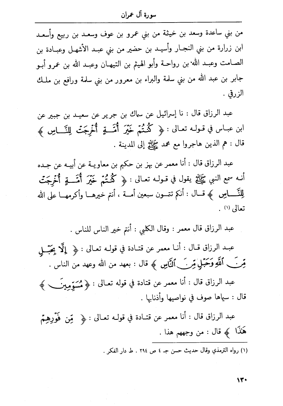 عبد الرزاق قال نا إسرائيل عن سماك بن جرير عن سعيد بن جبير ابن عباس في قوله تعالى كنتم خير أمة أخرجت للناس قال هم الذين هاجروا مع محمد إلى المدينة