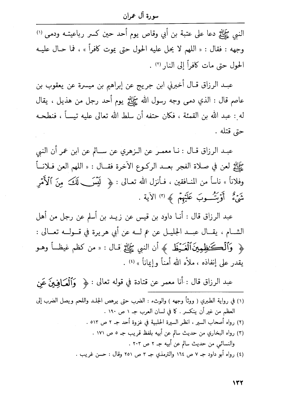 عبد الرزاق قال نا معمر عن الزهري عن سالم عن ابن عمر أن النبي لعن في صلاة الفجر بعد الركوع الآخرة فقال اللهم العن فلانا وفلانا ناسا من المنافقين فأنزل الله تعالى ليس لك من الأمر شىء أو يتوب عليهم الآية