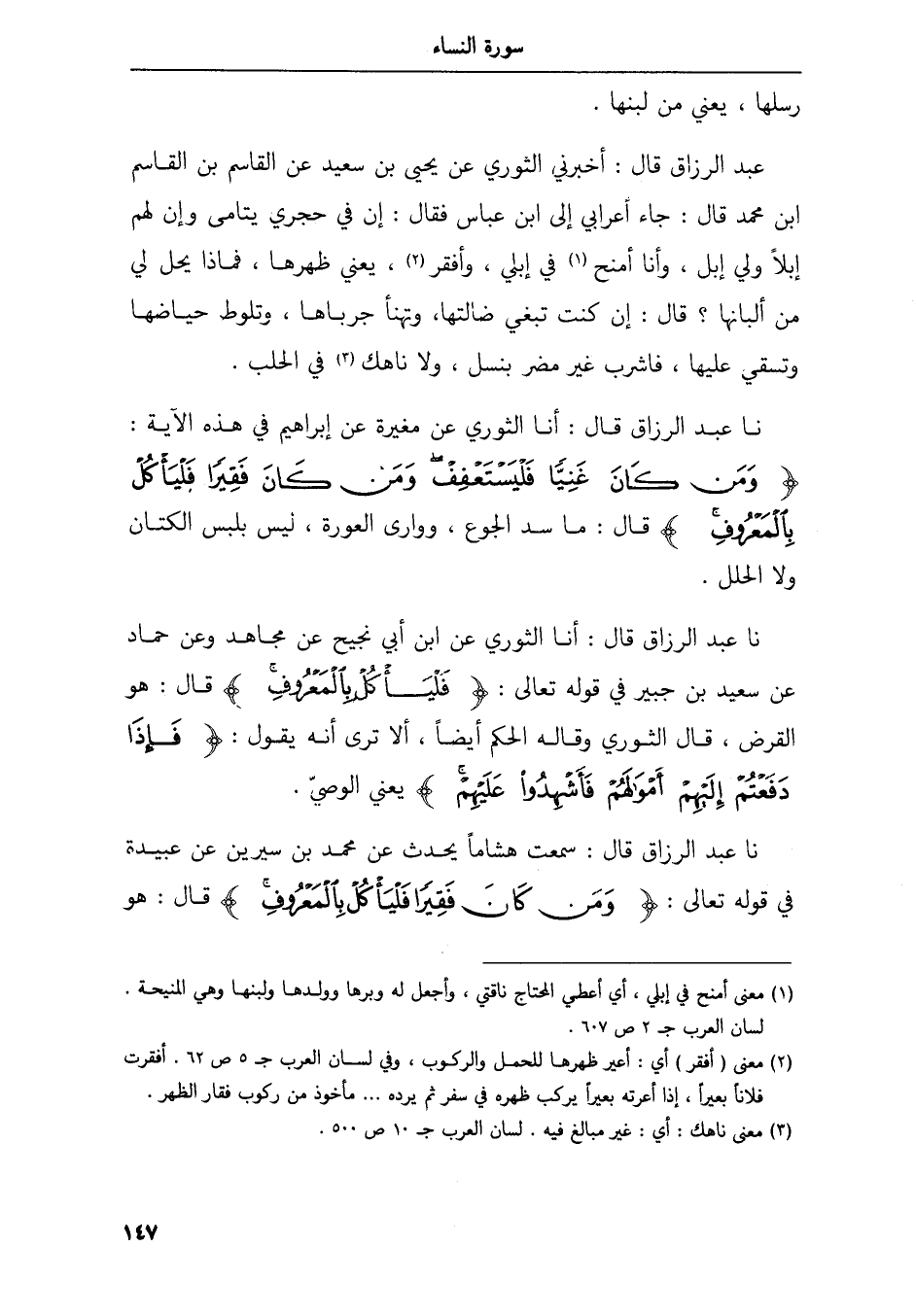 نا عبد الرزاق قال أنا الثوري عن ابن أبي نجيح عن مجاهد وعن حماد عن سعيد بن جبير في قوله تعالى فليأكل بالمعروف قال هو القرض قال الثوري وقاله الحكم أيضا ألا ترى أنه يقول فإذا دفعتم إليهم أمولهم فأشهدوا عليهم يعني الوصي