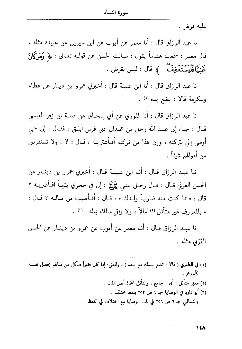 نا عبد الرزاق قال أنا معمر عن أيوب عن ابن سيرين عن عبيدة مثله قال معمر سمعت هشاما يقول سألت الحسن عن قوله تعالى ومن كان غنيا فليستعفف قال ليس بقرض
