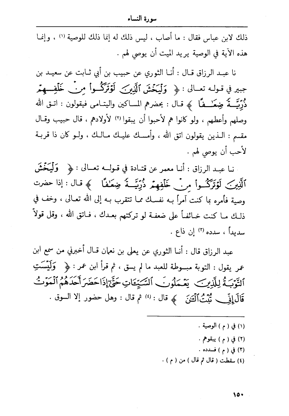 نا عبد الرزاق أنا معمر عن قتادة في قوله تعالى وليخش الذين لو تركوا من خلفهم ذرية ضعفا قال إذا حضرت وصية فأمره بما كنت آمرا به نفسك مما تتقرب به إلى الله تعالى وخف في ذلك ما كنت خائفا على ضعفة لو تركتهم بعدك فاتق الله وقل قولا سديدا سدده إن ذاع