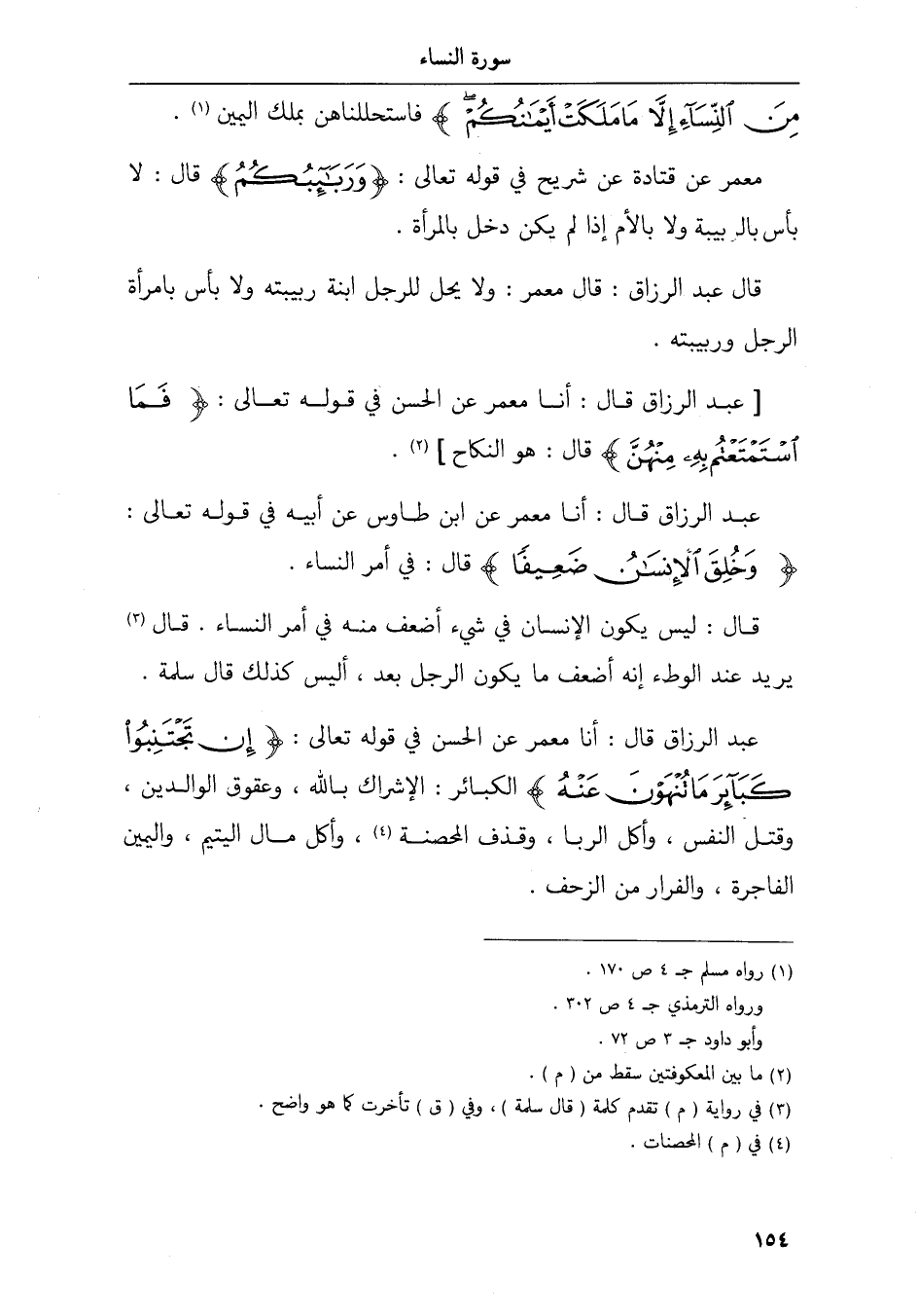 عبد الرزاق قال أنا معمر عن الحسن في قوله تعالى إن تجتنبوا كبائر ما تنهون عنه الكبائر الإشراك بالله وعقوق الوالدين وقتل النفس وأكل الربا وقذف المحصنة وأكل مال اليتيم واليمين الفاجرة والفرار من الزحف
