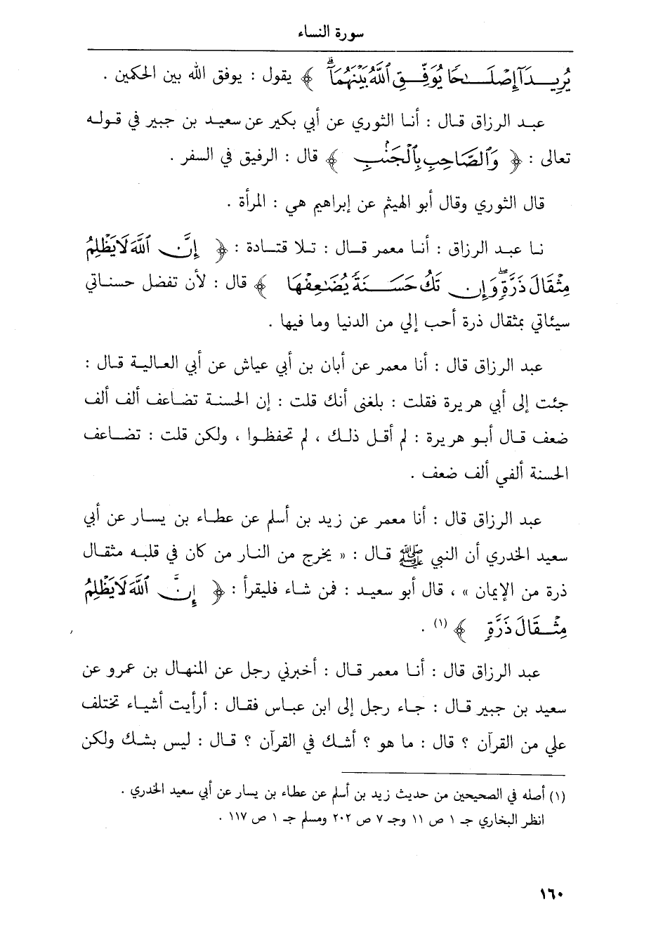 عبد الرزاق قال أنا معمر عن زيد بن أسلم عن عطاء بن يسار عن أبي سعيد الخدري أن النبي قال يخرج من النار من كان في قلبه مثقال ذرة من الإيمان قال أبو سعيد فمن شاء فليقرأ إن الله لا يظلم مثقال ذرة