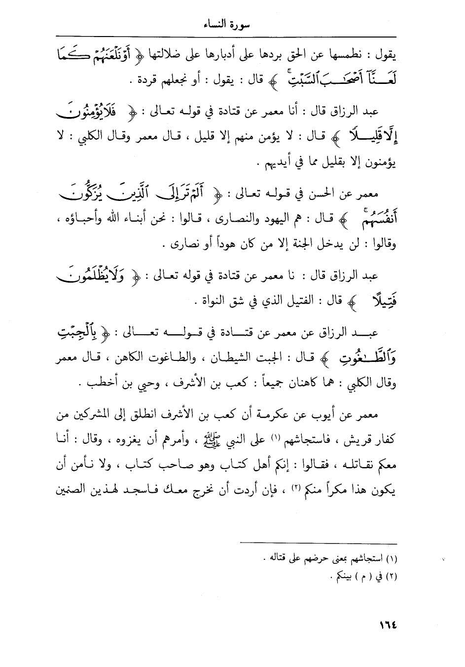 عبد الرزاق قال أنا معمر عن قتادة في قوله تعالى فلا يؤمنون إلا قليلا لا يؤمن منهم إلا قليل قال معمر وقال الكلبي لا يؤمنون إلا بقليل مما في أيديهم