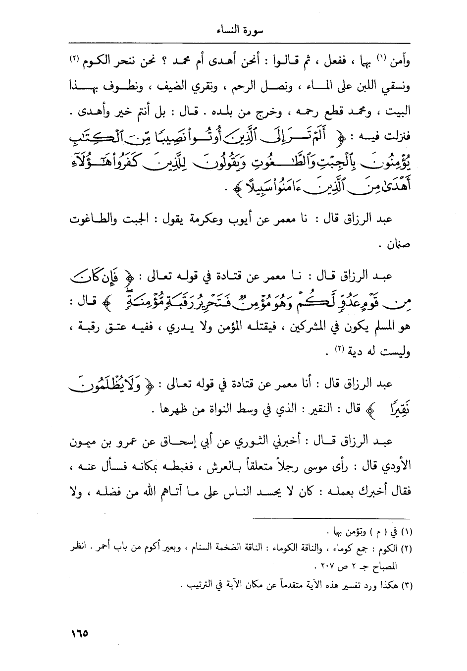 عبد الرزاق قال أنا معمر عن قتادة في قوله تعالى ولايظلمون نقيرا قال النقير الذي في وسط النواة من ظهرها