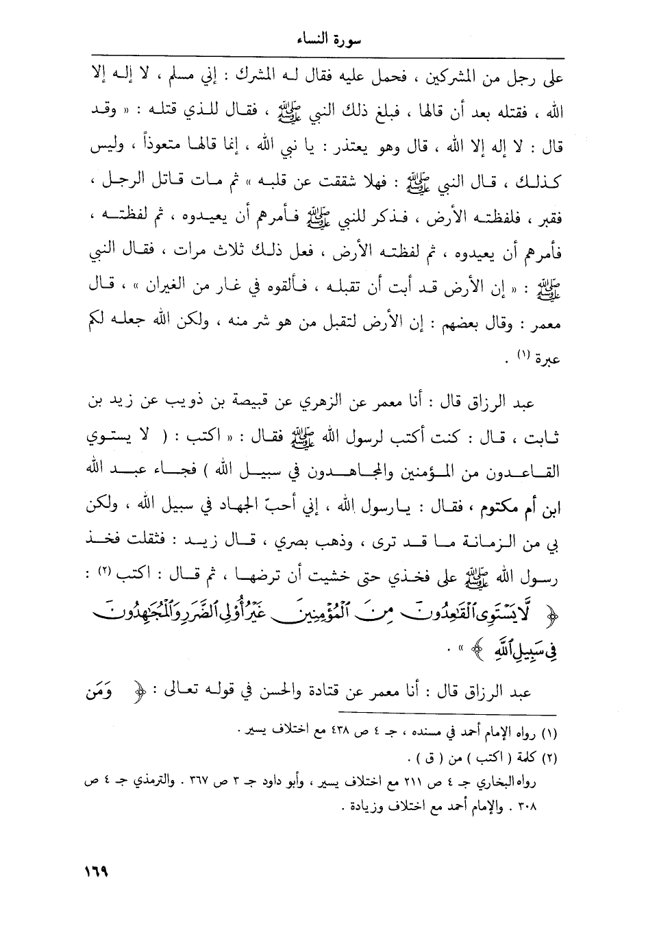 عبد الرزاق قال أنا معمر عن الزهري عن قبيصة بن ذويب عن زيد بن ثابت قال كنت أكتب لرسول الله فقال اكتب لا يستوي القاعدون من المؤمنين والمجاهدون في سبيل الله فجاء عبد الله ابن أم مكتوم فقال يا رسول الله إني أحب الجهاد في سبيل الله ولكن بي من الزمانة ما قد ترى وذهب بصري قال زيد فثقلت فخذ رسول الله على فخذي حتى خشيت أن ترضها ثم قال اكتب لا يستوى القعدون من المؤمنين غير أولى الضرر والمجهدون في سبيل الله