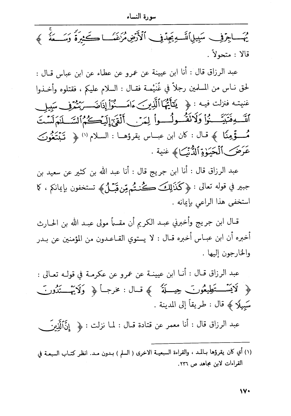 عبد الرزاق قال أنا ابن عيينة عن عمرو عن عطاء عن ابن عباس قال لحق ناس من المسلمين رجلا في غنيمة فقال السلام عليكم فقتلوه وأخذوا غنيمته فنزلت فيه يأيها الذين ءامنوا إذا ضربتم في سبيل الله فتبينوا ولا تقولوا لمن ألقى إليكم السلم لست مؤمنا قال كان ابن عباس يقرؤها السلام تبتغون عرض الحيوة الدنيا غنيمة