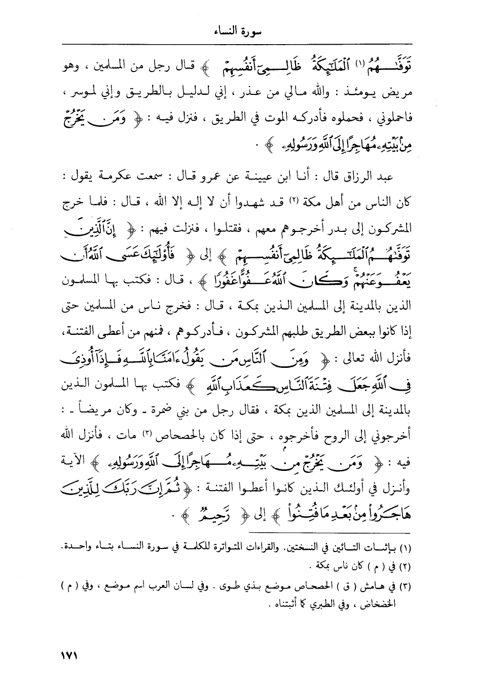 عبد الرزاق قال أنا ابن عيينة عن عمرو قال سمعت عكرمة يقول كان الناس من أهل مكة قد شهدوا أن لا إله إلا الله قال فلما خرج المشركون إلى بدر أخرجوهم معهم فقتلوا فنزلت فيهم إن الذين توفهم الملئكة ظالمى أنفسهم إلى فأولئك عسى الله أن يعفو عنهم وكان الله عفوا غفورا قال فكتب بها المسلمين الذين بالمدينة إلى المسلمين الذين بمكة قال فخرج ناس من المسلمين حتى إذا كانوا ببعض الطريق طلبهم المشركون فأدركوهم فمنهم من أعطى الفتنة فأنزل الله تعالى ومن الناس من يقول ءامنا بالله فإذا أوذى في الله جعل فتنة الناس كعذاب الله فكتب بها المسلمون الذين بالمدينة إلى المسلمين الذين بمكة فقال رجل من بني ضمرة وكان مريضا أخرجوني إلى الروح فأخرجوه حتى إذا كان بالحصحاص مات فأنزل الله فيه ومن يخرج من بيته مهاجرا إلى الله ورسوله الآية وأنزل في أولئك الذين كانوا أعطوا الفتنة ثم إن ربك للذين هاجروا من بعد ما فتنوا إلى رحيم