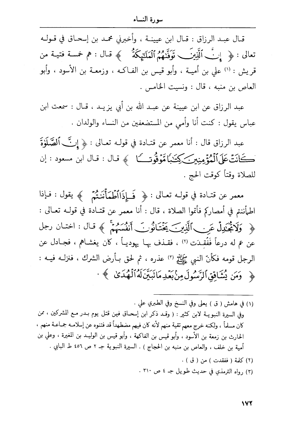 عبد الرزاق قال ابن عيينة وأخبرني محمد بن إسحاق في قوله تعالى إن الذين توفهم الملئكه قال هم خمسة فتية من قريش علي بن أمية و أبو قيس بن الفاكه وزمعة بن الأسود وأبو العاص بن منبه قال ونسيت الخامس