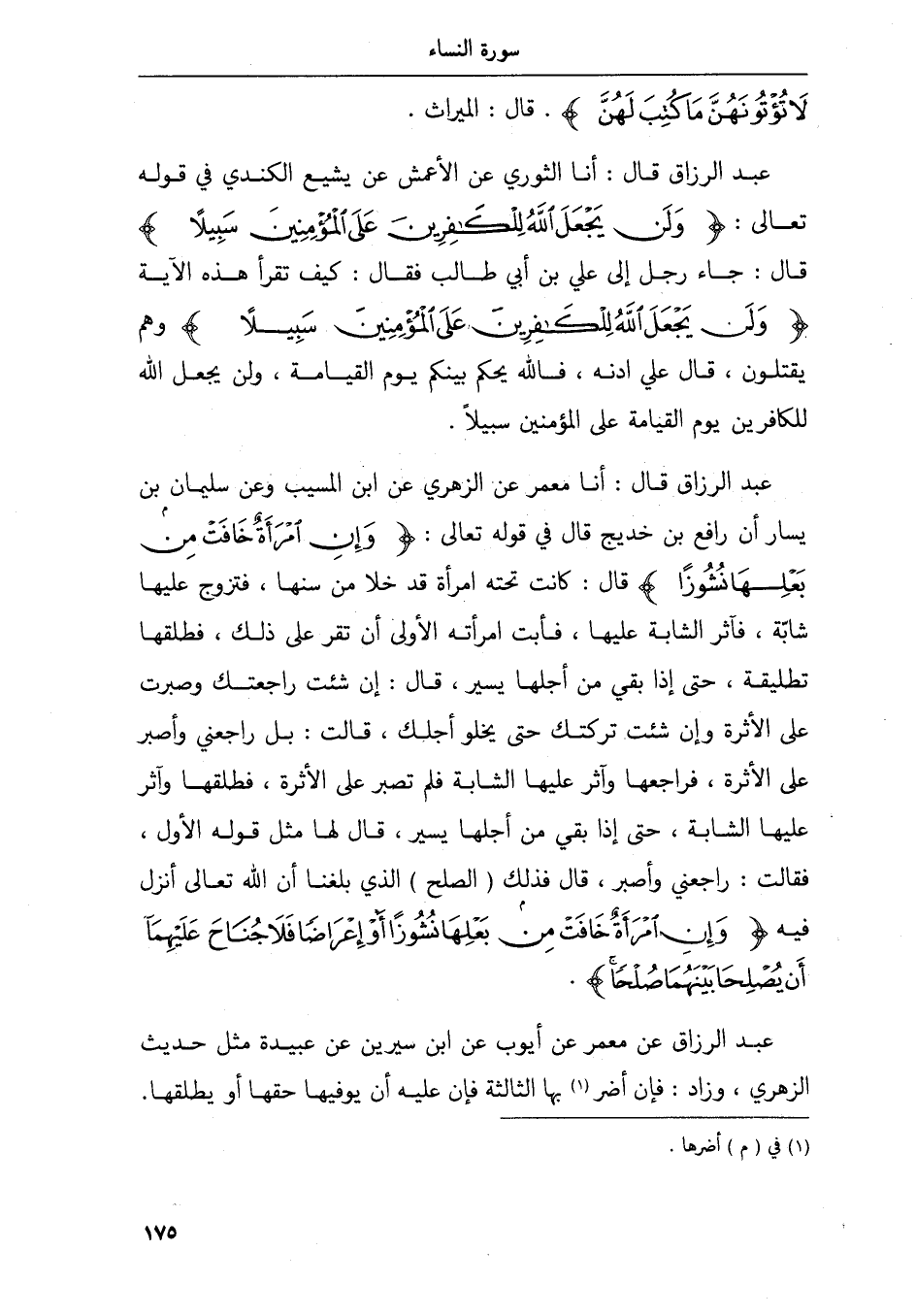 عبد الرزاق قال أنا معمر عن الزهري عن ابن المسيب وعن سليمان بن يسار أن رافع بن خديج قال في قوله تعالى وإن امرأة خافت من بعلها نشوزا قال كانت تحته امرأته قد خلا من سنها فتزوج عليها شابة فآثر الشابة عليها فأبت امرأته الأولى أن تقر على ذلك فطلقها تطليقة حتى إذا بقي من أجلها يسير قال إن شئت راجعتك وصبرت على الأثرة وإن شئت تركتك حتى يخلو أجلك قالت بل راجعني وأصبر على الأثرة فراجعها وآثر عليها الشابة فلم تصبر على الأثرة فطلقها وآثر عليها الشابة حتى إذا بقي من اجلها يسير قال لها مثل قوله الأول فقالت راجعني وأصبر قال فذلك الصلح الذي بلغنا أن الله تعالى أنزل فيه وإن امرأة خافت من بعلها نشوزا أو إعراضا فلا جناح عليهما أن يصلحا بينهما صلحا