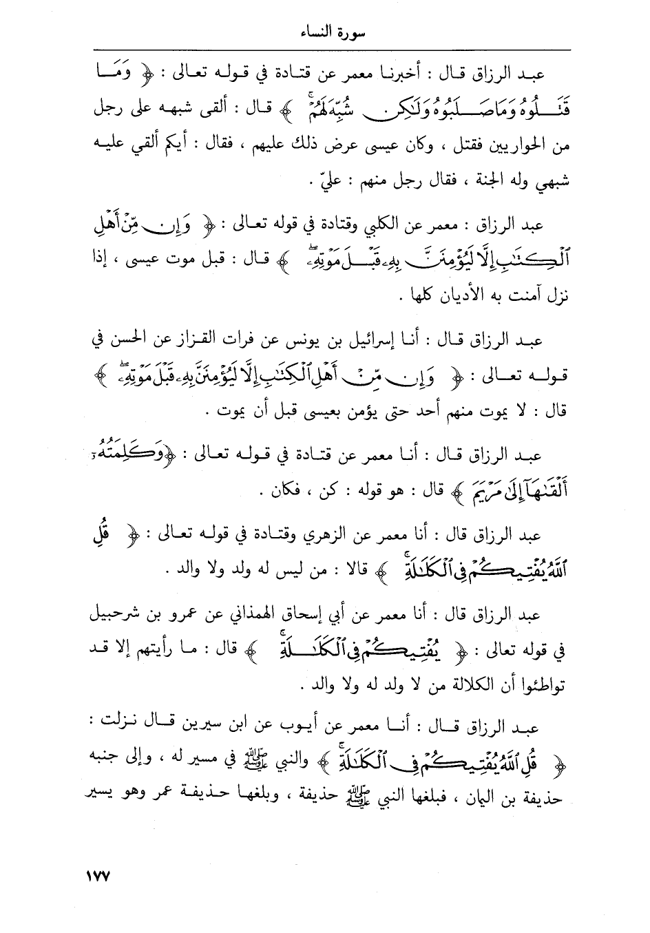 عبد الرزاق قال أنا معمر عن أيوب عن ابن سيرين قال نزلت قل الله يفتيكم في الكلالة والنبي صلى الله عليه و سلم في مسير له وإلى جنبه حذيفة بن اليمان فبلغها النبي حذيفة وبلغها حذيفة عمر وهو يسير