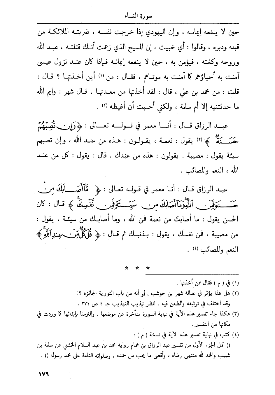 عبد الرزاق قال أنا معمر في قوله تعالى وإن تصبهم حسنة يقول نعمة يقولون هذه من عند الله وإن تصبهم سيئة يقول مصيبة يقولون هذه من عندك قال يقول كل من عند الله النعم والمصائب
