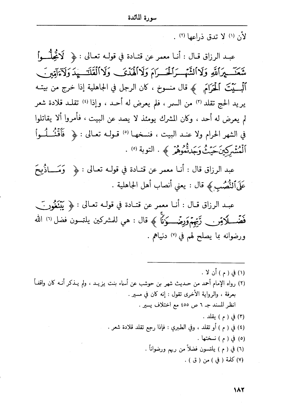 عبد الرزاق قال أنا معمر عن قتادة في قوله تعالى لا تحلوا شعئر الله ولا الشهر الحرام ولا الهدى ولا القلئد ولا ءامين البيت الحرام قال منسوخ كان الرجل في الجاهلية إذا خرج من بيته يريد الحج تقلد من السمر فلم يعرض له أحد وإذا تقلد قلادة شعر لم يعرض له أحد وكان المشرك يومئذ لا يصد عن البيت فأمروا ألا يقاتلوا في الشهرالحرام ولا عند البيت فنسخها قوله تعالى فاقتلوا المشركين حيث وجدتموهم التوبة