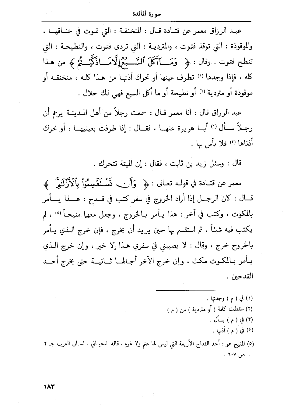 عبد الرزاق معمر عن قتادة قال المنخنقة التي تموت في خناقها والموقوذة التي توقذ فتموت والمتردية التي تردى فتموت والنطيحة التي تنطح فتموت وقال وما أكل السبع إلا ما ذكيتم من هذا كله فإذا وجدها تطرف عينها أو تحرك أذنها من هذا كله منخنقة أو موقوذة أو متردية أو نطيحة أو ما أكل السبع فهي لك حلال