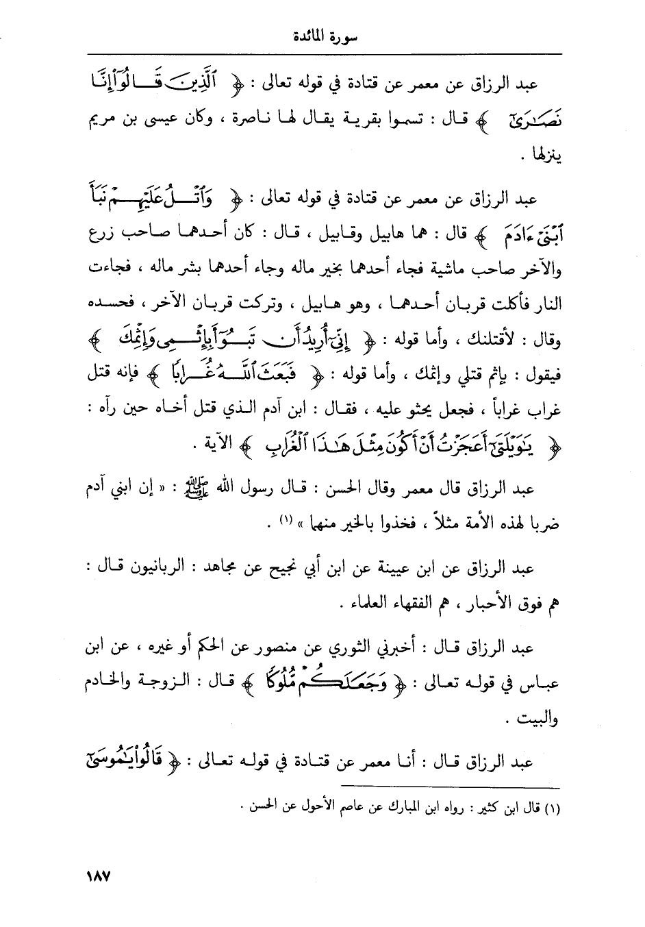 عبد الرزاق عن معمر عن قتادة في قوله تعالى واتل عليهم نبأ ابنى ءادم قال هما هابيل وقابيل قال كان أحدهما صاحب زرع والآخر صاحب ماشية فجاء أحدهما بخير ماله وجاء أحدهما بشر ماله فجاءت النار فأكلت قربان أحدهما وهو قابيل وتركت قربان الآخر فحسده وقال لأقتلنك وأما قوله إنى أريد أن تبوأ بإثمي وإثمك فيقول بإثم قتلي وإثمك وأما قوله فبعث الله غرابا فإنه قتل غراب غرابا فجعل يحثو عليه فقال ابن آدم الذي قتل أخاه حين رآه يويلتى أعجزت أن أكون مثل هذا الغراب الآية